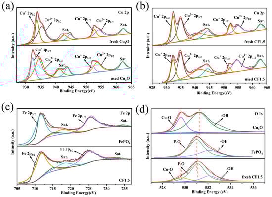 Subsequently, XPS analyses were conducted on fresh Cu2O, used Cu2O, fresh CF1.5, and used CF1.5 and FePO4 samples (Figure 4a–d). As shown in Figure 4a, the XPS spectrum of Cu exhibits two peaks at 932.3 eV and 952.4 eV, corresponding to Cu+ 2p3/2 and Cu+ 2p1/2, respectively [41]. The presence of Cu2+ primarily results from the oxidation of Cu2O to CuO during the preparation process [42,43]. Two additional weak peaks for Cu2+ are observed at 934.3 eV and 955.0 eV for Cu 2p3/2 and Cu 2p1/2, respectively [44]. The content of monovalent copper in used Cu2O significantly decreases, while the divalent copper content increases, indicating substantial photocorrosion of Cu2O. This change was attributed to the effective migration of valence electron density away from the Cu nucleus, resulting in reduced inner-shell electron shielding. Compared to the peak of Cu2O before the reaction, the Cu 2p peak of Cu2O after the reaction showed a noticeable blue shift [45]. Figure 4b clearly shows that the Cu+ content in both fresh CF1.5 and used CF1.5 remains largely unchanged, further demonstrating the superior anti-photocorrosion capability of CF1.5. Compared to the Cu 2p1/2 peak of fresh CF1.5, the Cu 2p1/2 peak of used CF1.5 exhibits a red shift. Additionally, the rearrangement of outer-shell electrons in Cu has resulted in the appearance of three satellite peaks at 943.6 eV, 941.6 eV, and 962.2 eV in the Cu 2p spectrum [44]. As shown in Figure 4c, the Fe 2p band could be reverse-spun into four peaks of 711.6 eV, 718.1 eV, 724.9 eV and 732.7 eV, which belong to Fe 2p3/2, the satellite peaks of Fe 2p3/2, Fe 2p1/2 and the satellite peaks of Fe 2p1/2, respectively. This confirmed the presence of Fe3+ in the material [46,47]. Increased electrical screening of the inner shell of Fe causes the Fe 2p peak of CF1.5 to redshift compared to pure Cu2O. The O 1s spectrum in Figure 4d can be convolved into three sub-peaks, and the O1 peak at 532.1 eV corresponds to the hydroxyl group adsorbed on the surface [48]. Hydroxy–oxygen could not only improve the photocatalytic ability of the composite, but also promote the photocatalytic reaction. The O2 peak appearing at 531.09 eV was the formation of the P-O bond in PO43−. The O3 peak at 529.7 eV was attributed to lattice oxygen (O2) induced by O bonding with metals Cu and Fe [49,50]. It is well known that changes in electron binding energy are due to changes in the coulomb force between the nucleus and its outer electrons [51,52]. Compared with pure Cu2O and pure FePO4, the binding energy of Cu, Fe, P, and O in CF1.5 moved in a lower or higher direction, which confirms the charge movement after Cu2O and FePO4 contact [53]. The wide peak shown in Figure S6 corresponds to the binding energy of P 2p associated with P(V) in PO43−, which is consistent with the findings reported by Wu et al. [54]. The results from the cyclic experiments and XPS analyses provide robust evidence supporting the superior anti-photocorrosion properties of CF1.5 and the formation of the heterojunction.
