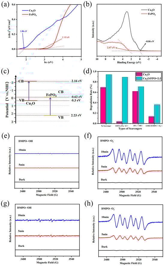The direct bandgap width of pure Cu2O and pure FePO4 were measured by using Kubelka–Munk theory. As shown in Figure 5a, the bandgap energies of pure Cu2O and pure FePO4 were 1.86 eV and 2.85 eV, respectively, consistent with the results reported by Beshkar and Wang et al. [31,49]. Meanwhile, the EVB,xps of Cu2O and FePO4 were −0.06 eV and 2.47 eV (Figure 5b) according to the XPS valence band spectrum, respectively. The valence bands of Cu2O and FePO4 can be calculated using Equation (3):