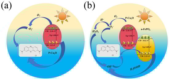 Based on the above result analysis, we propose a Z-scheme mechanism of MB degradation by Cu2O/FePO4 (Figure 6). In Figure 6a, the diagram illustrates the degradation mechanism of Cu2O. According to the results of free radical capture experiments and ESR testing, it is known that the active species involved in the Cu2O reaction are superoxide radicals (·O2−) and holes (h+). Cu2O nanoparticles are excited by sunlight to produce photogenerated electrons and photogenerated holes. The optical excitation of electrons transfers them to the Cu2O surface, where they then react with dissolved oxygen to generate super oxygen free radicals (O2−) [55]. On the other hand, photogenic holes can oxidize water or hydroxyl group (OH−) adsorbed on the catalyst surface to form hydroxyl radicals (·OH). These strongly oxidizing hydroxyl (·OH) radicals, superoxide radicals (·O2−), and holes (h+) participate in the degradation process of dyes [56,57]. Figure 6b shows the photocatalytic mechanism of the Cu2O/FePO4 heterojunction after contact. The electrons in the Cu2O and FePO4 valence bands were stimulated by light and transferred to the conduction bands of Cu2O and FePO4, leaving holes in their valence bands, respectively. Since the ECB (−2.16 eV) of Cu2O is more negative than that of O2/·O2− (−0.33 eV vs. NHE), the e− of the valence band of Cu2O has a strong reducing ability. Similarly, h+ in the valence band of FePO4 was more positively charged than H2O/·OH (1.99 eV vs. NHE), and its accumulation of photogenic holes in the valence band could effectively oxidize H2O to ·OH. The active substance ·O2− produced on the surface of Cu2O could not only directly participate in the degradation of pollutants, but also combine with H+ to produce H2O2, and then decompose into ·OH, which acts on pollutants together with the ·OH produced on the surface of FePO4. Compared to individual Cu2O, where some of the holes participate in the degradation of pollutants while others can oxidize Cu2O itself, in the Cu2O/FePO4 system, the band alignment between Cu2O and FePO4 enables the photogenerated holes in the valence band of Cu2O to recombine with the photogenerated electrons transferred from the conduction band of FePO4. This process effectively prevents the self-oxidation of photogenerated holes in Cu2O, thereby suppressing photocorrosion. Ultimately, this results in a Z-scheme heterojunction photocatalytic composite material with high stability and enhanced photocatalytic activity.