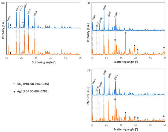 XRD results obtained for zeolites and catalysts containing 14.7 wt.% Ag supported on them: (a) zeolite A, space group Pm-3m, a = 12.326 Å; (b) zeolite 10X, space group Fd3m, a = 25.023 Å; (c) zeolite 13X, space group Fd-3, a = 25.021 Å.