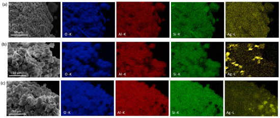 Elemental maps of the zeolite catalysts: (a) 14.7Ag/5A, (b) 14.7Ag/10X, and (c) 14.7Ag/13X.