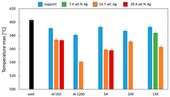 The temperature of the maximum rate of soot combustion was used to compare the activity of the supports and catalysts in soot combustion. The results are compiled in Figure 8. Without a catalyst the maximum rate of soot combustion occurs at approximately 600 °C. The results of all the supports were similar, except for alumina calcined at 1200 °C. It is noteworthy that the alumina calcined at 550 °C is less active despite having a higher surface area and the same composition. This may be due to one of two reasons: different active sites or increased hardness of the alumina, which results in a tighter contact during grinding. Nevertheless, the silver catalyst supported on the high-temperature alumina was much more active in soot combustion than the support itself, indicating that silver is the active component. The activity of the catalysts with 14.7 wt.% falls in the order Ag/Al 1200 > Ag/5A ≈ Ag/13X > Ag/10X ≈ Ag/Al 550. It can be argued that the catalyst obtained with alumina calcined at 550 °C was less active than that obtained at 1200 °C because the latter has a smaller surface area and hence more silver is found on the surface. Therefore, a catalyst with much more silver on Al 550 was synthesized and tested. The XRD pattern of this catalyst is shown in Figure S5c. The soot combustion results show that an increase in the silver loading does not lead to an increase of activity (Figure 8), which means that the higher activity of Ag/Al 1200 is most likely due to something else, e.g., interaction of the support with the active phase. This difference is a valuable observation, despite the fact that more active catalysts for soot combustion have been obtained by other research groups, e.g., Shimizu et al. [48], Sevre et al. [49], and even in our own, previously reported studies [46].