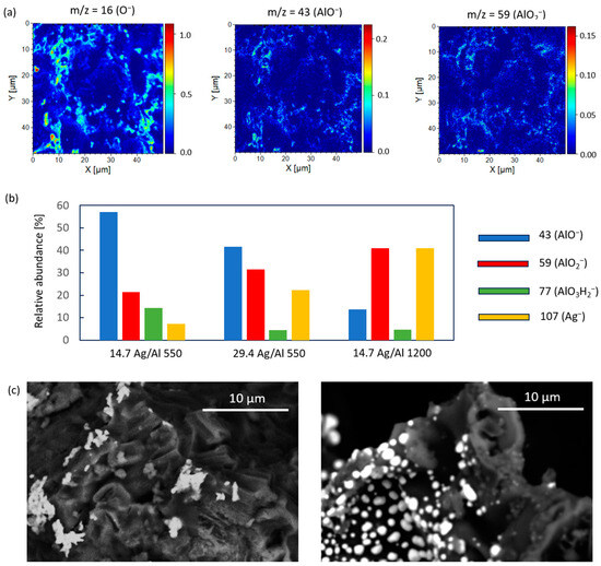 ToF SIMS results: (a) selected negative ion maps from 14.7Ag/Al 550, (b) relative abundances of selected ions in the negative ion spectra of alumina-supported catalysts, and (c) CBS images of 14.7Ag/Al 550 and 14.7Ag/Al 1200 obtained at a magnification of 20,000.
