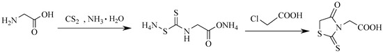 At present, the preparation of 3-carboxymethyl rhodanine still mainly relies on the aforementioned method. Some studies have proposed an improved approach, in which glycine directly reacts with dicarboxymethyl trithiocarbonate to produce 3-carboxymethylrhodanine (see Scheme 3) [21]. However, the starting material used in this method is expensive and still needs to be prepared with carbon disulfide. Therefore, nearly all studies continue to use the previously described synthetic route (see Scheme 2) to prepare 3-carboxymethyl rhodanine.
