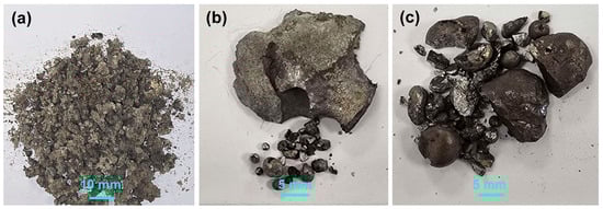 The base case sample did not form any significant metal within the reaction time, and at the low temperature of the muffle furnace (1350 °C), the crucible contents consisted of a loosely sintered mixture. The magnetic fraction of this sample is shown in Figure 1a. Figure 1b,c show that large alloy blobs were effectively separated from the slag in samples A and C, with some smaller metal droplets. It is seen that sample A formed one large alloy volume, and sample C formed multiple smaller alloy volumes. Thus, in sample A with added C and Al, and sample C with added C, Si, and Al, clear slag and alloy formation and separation were achieved.