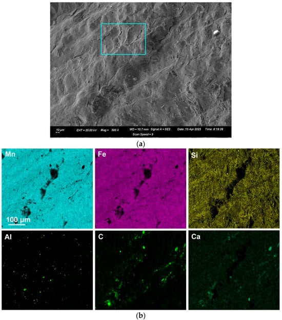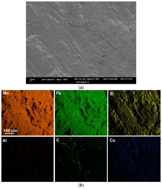 (a): SEM image (×2000) of blocked area in Sample A as marked in Figure 2a; (b): EDX map of area in (a).