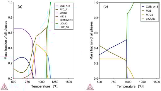 Phase chemistry of alloy: (a) Sample A alloy; (b) Sample C alloy: Calculated in Thermo-Calc [20].