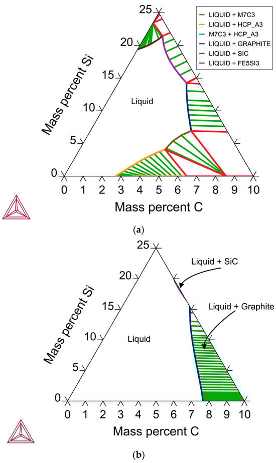 Although C was added in the form of coal, and ample C is available from contact with the graphite crucible, the take-up of carbon in the alloy is limited. The addition of coal as a reductant is intended to facilitate rapid pre-reduction to the MnO level, as previous studies have highlighted the need for pre-roasting MnO2 ore to lower oxides and limit excessive heat release [11]. The synergistic effect of Si, acting both as a reductant and influencing alloy carbon uptake, is evident from the reduction work performed by Si and the expected decrease in carbon uptake in the Fe–Mn alloy with increased Si content [2]. This effect is shown in Figure 6a,b for the Mn-Si-C system at 1250 °C and 1450 °C. It is seen that for the phase boundary of liquid and graphite, the carbon saturation level of the liquid phase decreases with an increase in %Si. For example, in Figure 6a, the phase boundary of liquid and graphite coordinates varies from 5.2% C at 8.7% Si to 3.4% C at 13.4% Si. This effect is shown more clearly in Figure 6b when fewer solid phases are stable.
