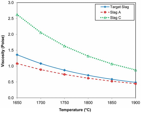 The viscosities and phase chemistries of the slags were calculated using FactSage 7.3 thermochemical software, which utilised the FToxid database, as discussed in the following section. Based on the alloy yield values in Table 7, the addition of Si metal as a reductant aids overall alloy formation. However, a proportionally greater amount of alloy appears to be trapped in the slag. Figure 7 shows the calculated viscosity values of the slags at temperatures ranging from 1650 °C to 1900 °C. The slag liquidus temperatures are as follows: target slag at 1373 °C, slag A at 1652 °C, and slag C at 1530 °C. The higher SiO2 containing slag in sample C is more viscous than the target slag and the sample A slag. This difference can account for the higher fraction of entrapped alloy in slag C. However, the viscosity values below 3 Poise should be all tappable slags in an industrial setting [23].
