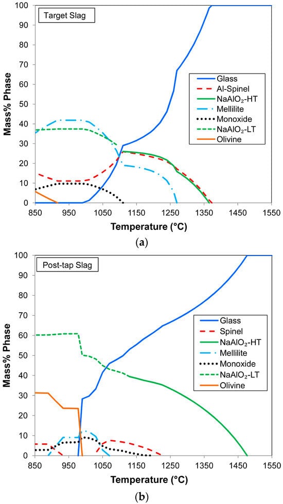 (a) Target slag phase chemistry calculated in FactSage [24]; (b) possible post-tap modified slag phase chemistry calculated in FactSage [24].