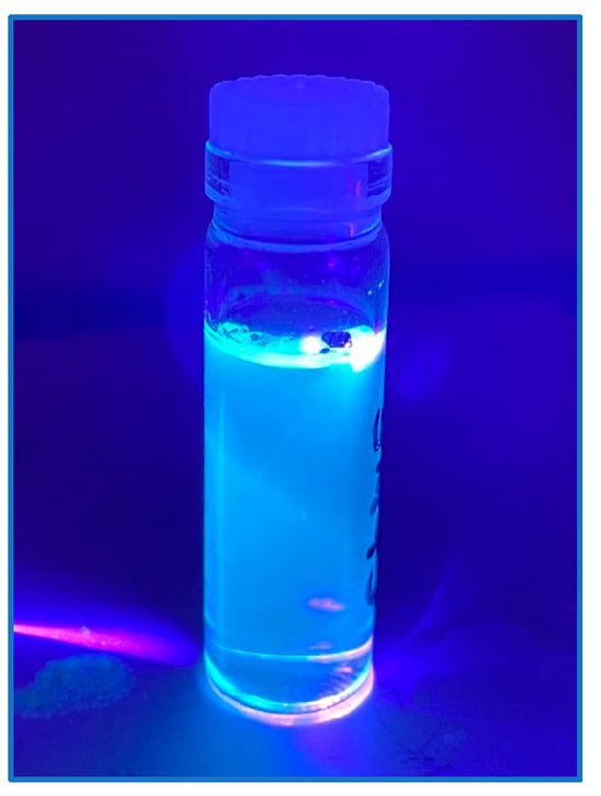 A sample of 1,2,4-triphenyltriphenylene (6) dissolved in dichloromethane and illuminated with a 405 nm laser.