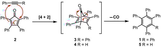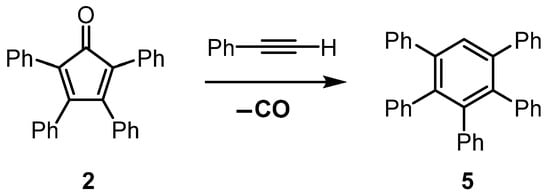 The analogous reaction of tetracyclone (2) and phenylacetylene via norbornadien-7-one derivative 4 to form pentaphenylbenzene (5) does not require such forcing conditions and can be achieved when the reaction temperature is <300 °C (Scheme 1) [7].