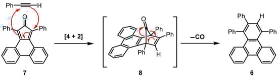 Diels–Alder reaction between phencyclone (7) and phenylacetylene, followed by cheletropic extrusion of carbon monoxide from transient intermediate 8 to form 1,2,4-triphenyltriphenylene (6).