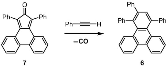 1,2,4-Triphenyltriphenylene (6) is usually prepared by a Diels–Alder [4 + 2] cycloaddition reaction of phencyclone (7, 1,3-diphenyl-2H-cyclopenta[l]phenanthren-2-one) with phenylacetylene. The initial cycloadduct formed is norbornadien-7-one derivative 8 (Scheme 2); however, this transient intermediate then undergoes facile cheletropic release of carbon monoxide gas to obtain the desired product (6).