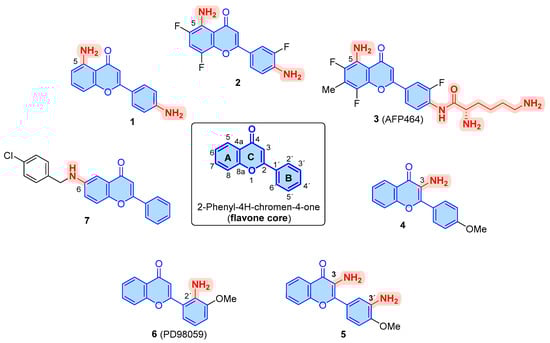Flavonoids represent a diverse group of heterocyclic molecules featuring oxygen in their structure. They are categorized into six main subclasses and are commonly found in plant-based foods and beverages including fruits, vegetables, cocoa, cereals, tea, and wine [1]. Among these, flavones consist of two aromatic rings (A and B) and a heterocyclic pyranone ring (C), forming the framework of 2-phenyl-4H-chromen-4-one (Figure 1) [2,3]. In particular, aminoflavones are flavone derivatives that have been modified to include one or more amino groups (-NH2) attached to various positions on the flavone core structure. These amino groups can also be further substituted, enhancing the diversity and potential biological activity of the compounds. It is also observed that the 3′ and 4′ positions are often mono- or di-substituted by electron-donating groups such as methoxy groups [4].