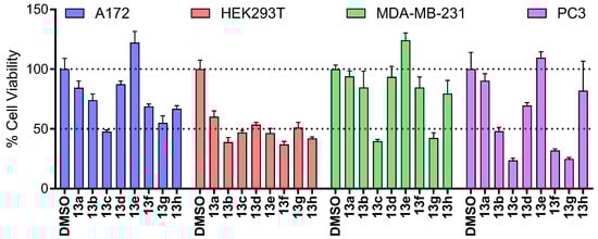 To assess the cytotoxic effects of the compounds 13a–h, we initially conducted an MTT assay using four tumorigenic cell lines (A172, HEK293T, MDA-MB-231, and PC3) [26]. The first screening was performed at a concentration of 100 µM to identify compounds exhibiting cytotoxicity at a high concentration (Figure 2). We observed that substituents in the 6-arylamine group strongly impacted cellular viability when compared to the vehicle control (DMSO). Comparing 13a with 13b, we found that the 4-methoxy substituent appeared to reduce the basal toxic effects, as 13a was non-toxic to the tested cell lines. Of note, 13c (4-trifluoromethyl) exhibited preferential toxicity towards PC3 (prostate adenocarcinoma) cells compared to the other cell lines, whereas, shifting the trifluoromethyl from the para-position in 13c to the ortho-position in 13d, almost abolished the toxic effect on tumor cells. On the other hand, this effect was inverted when the 4-fluoro group (13e) was replaced by a 2-fluoro (13f). Furthermore, switching the 4-fluoro (13e) to a 4-chloride (13g) regained toxicity towards A172, MDA-MB-231, and, especially, PC3 cells as observed in 13c, whereas a 4-methyl (13h) substitution abolished this effect.