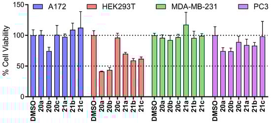 Cellular toxicity of 6-arylaminoflavones 20a–c and 21a–c. Results are expressed as viable cells relative to vehicle control (DMSO). Data are expressed as mean + standard deviation of one experiment performed in quadruplicate (n = 4).