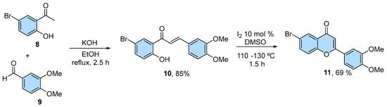 The synthetic pathway was accomplished in three key steps: the first two stages were dedicated to the construction of the flavone core, while the final step focused on the introduction of diverse arylamino groups at the 6-position of this ring. For the synthesis of the flavone core, firstly, a Claisen–Schmidt condensation [14] was performed between 5′-bromo-2′-hydroxyacetophenone 8 and 3,4-dimethoxybenzaldehyde 9 (Scheme 1). This reaction was carried out under reflux conditions in ethanol, using potassium hydroxide (KOH) as the base, yielding the corresponding α,β-unsaturated chalcone 10 with an 85% yield. Subsequently, an oxidative cyclization step was conducted using dimethyl sulfoxide (DMSO) and iodine (I2) as reagents [15]. In this step, DMSO was a dual function agent—a solvent and oxidizing agent—while iodine acted as an electrophilic species [16], enabling the efficient formation of the 6-bromoflavone intermediate 11 with a 69% yield.