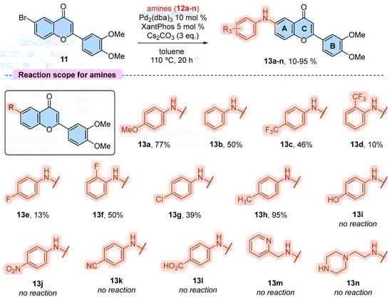 The optimization of the reaction conditions for the synthesis of 6-arylaminoflavone via Buchwald–Hartwig coupling reactions revealed significant differences in the efficiency of the employed conditions [18]. Initially, the coupling reaction was performed using Pd2(dba)3 as the catalyst, XantPhos as the ligand, and toluene as the solvent, while evaluating four different bases (entries 1–4, Table 1). In the first experiment, CsF was used as the base, but no reaction was observed (entry 1). Kónya and co-workers (2015) investigated the use of the stronger base, NaOtBu, in the Buchwald–Hartwig coupling for the synthesis of 6-arylaminoflavones derivatives [19]. The authors suggested that steric hindrance from the amine was a key factor limiting the overall yields, and that benzylamines were generally more suitable substrates. In our case, however, the use of NaOtBu resulted in only trace amounts of product (entry 2). In contrast, the desired compound 13a was successfully obtained when alkali metal carbonates such as K2CO3 and Cs2CO3 were employed (entries 3–4). Notably, although using a different substrate (6-tosyloxyflavone), Yuen and co-workers [20] also reported the synthesis of 6-aminoflavones via palladium-catalyzed cross-coupling using K2CO3 as the base. In our study, the optimal conditions were achieved with Cs2CO3, affording compound 13a in 77% yield (entry 4). The Cs2CO3 proved to be superior to other bases tested, reinforcing the need for moderately strong bases to efficiently activate the nucleophilic amine and subsequently form the C-N bond [21]. Subsequently, an alternative ligand—DavePhos—was employed (entry 5); however, it yielded results comparable to those obtained with XantPhos. Nevertheless, XantPhos, being a bidentate ligand, likely offers enhanced chelation and steric stabilization, resulting in a marginally superior yield [22]. Other palladium catalysts, such as PdCl2(PPh3)2, were also evaluated; however, the reactions did not yield superior results compared to those obtained with Pd2(dba)3 (20%; entry 6). Finally, replacing toluene with THF as the solvent (entry 7) resulted in reduced yields of the coupling product. This decrease in efficiency can be attributed to the coordination of polar solvents, such as THF, with the palladium center, which likely disrupts the catalytic cycle and compromises the reaction’s overall performance [23]. The screening of reaction conditions was limited to selected combinations of bases, ligands, and solvents. A more extensive optimization may further improve yields for challenging substrates and will be explored in future studies. Besides that, with optimized conditions established, which included flavone 11 (1.0 equiv), amine (1.2 equiv), Pd2(dba)3 (10 mol %), XantPhos (5 mol %), Cs2CO3 (3.0 equiv), and toluene at 110 °C for 20 h (entry 4), we investigated the scope of the Buchwald–Hartwig coupling reactions (Scheme 2).