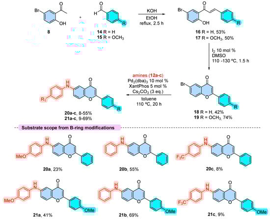 Synthetic route to obtain 6-arylaminoflavone derivatives (20a–c, 21a–c) with modification in the B-ring.