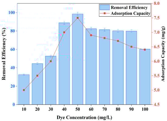 Figure 6 shows that the dyestuff concentration plays a crucial role in eliminating colourants, as demonstrated in batch studies. The dye dosage for the batch studies was varied from 10 to 100 mg L−1 under sustained conditions: pH 7.5, temperature 35 °C, biochar dosage 8 gL−1, and Contact time 90 min. The biochar resulted in a higher dye removal percentage (98.54%) compared to the results. The bar graph showed that the number of active sites on the adsorbent increased gradually with increasing initial dye concentration. The adsorption capacity differed from the removal rate: it first increased and then decreased with increasing dye concentration from 10 to 100 mg/L, reaching a maximum. The accumulation of dye molecules decreases the removal percentage at those active sites. After using 50 mg L−1, the removal efficiency decreased considerably; therefore, we selected this concentration as optimal for Astrazon pink on Prosopis juliflora Biochar.