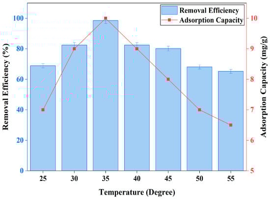 The endothermic reaction can occur as the adsorption capacity increases gradually with increasing temperature, favored by chemisorption. Likewise, as the temperature rises, the interatomic forces between the solvent and the adsorbent are high, and their nature is favourable to dye adsorption []. Simultaneously, as temperature increases, the biochar’s adsorption capacity decreases. It acts as an adsorption and exothermic reaction, which is favored by physisorption []. In the batch studies, three factors vary, while the remaining factors are held constant to estimate optimal parameters, including biochar dosage (8 g/L), contact time (90 min), pH (7.5), and initial dye concentration (50 mg/L). The highest elimination percentage was 98.54% at an optimum temperature of 35 °C for Prosopis juliflora biochar, as represented in Figure 9. Beyond 35 °C, there is no significant adsorption of the dye, and the percentage is reduced to 82.45%. This is due to the bond between the biochar and the dye solvent breaking under high temperatures. The results indicate that biochar is ineffective at higher movement rates due to its electrostatic interactions with molecules. Hence, the results show an optimum temperature of 35 °C.The adsorption capacity differed from the removal rate: it first increased and then decreased with temperature ranging from 25 to 55 °C, reaching a maximum.