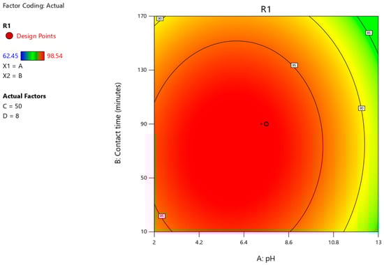 Table 5 presents the forecast Astrazon pink adsorption capacity (mg/g) obtained using Equation (11). We found that the obtained value and the experimental values (actual) were moderate, indicating that both the forecast and experimental values showed good agreement []. Using the experimental (actual) values and the expected response, the model determined the correlation coefficient (R2) to be 0.8073. The adsorption capacity of the process parameters accounts for 98.54% of the variability, and this model explains only 1.00% of the response variation [].