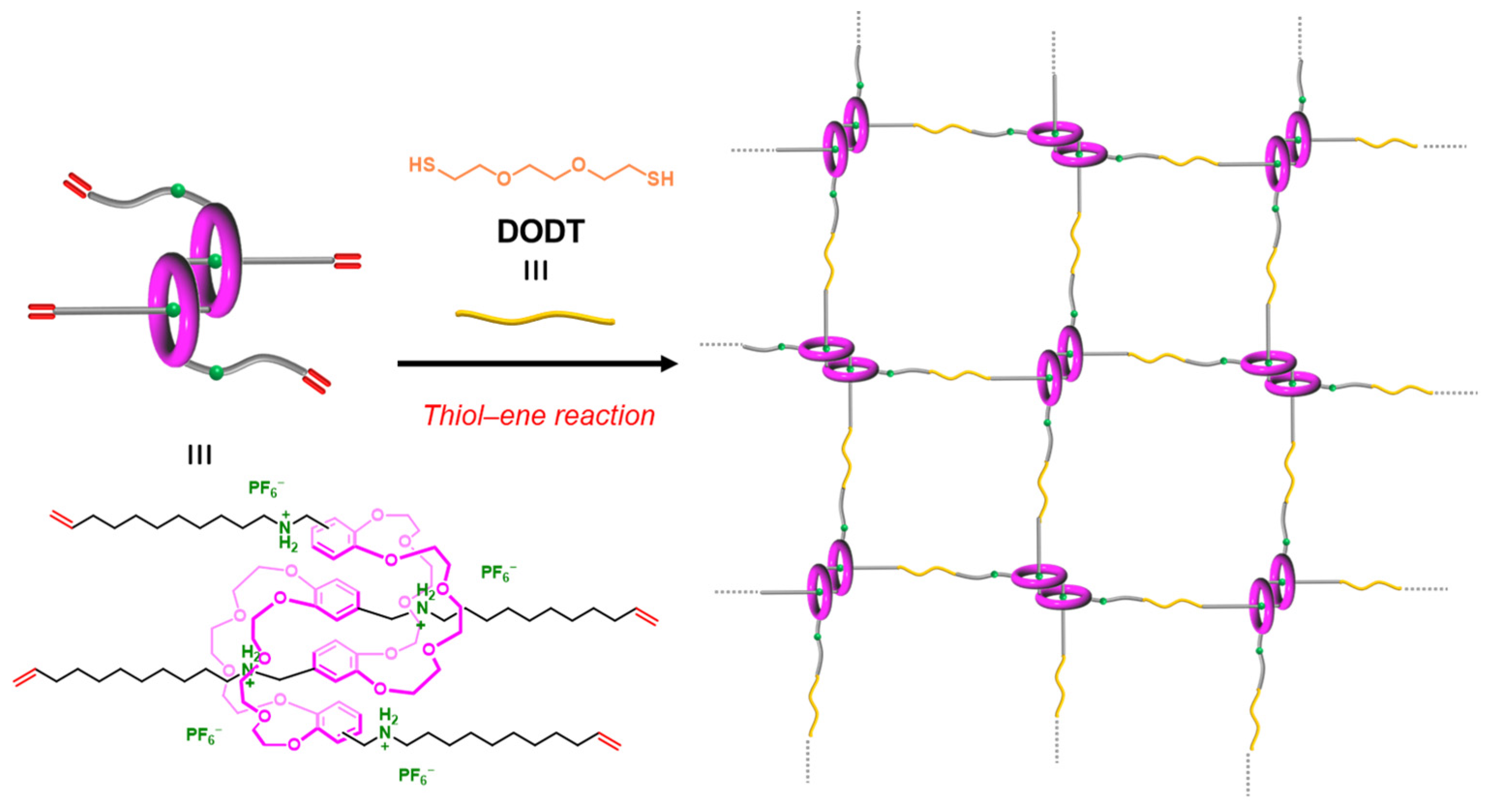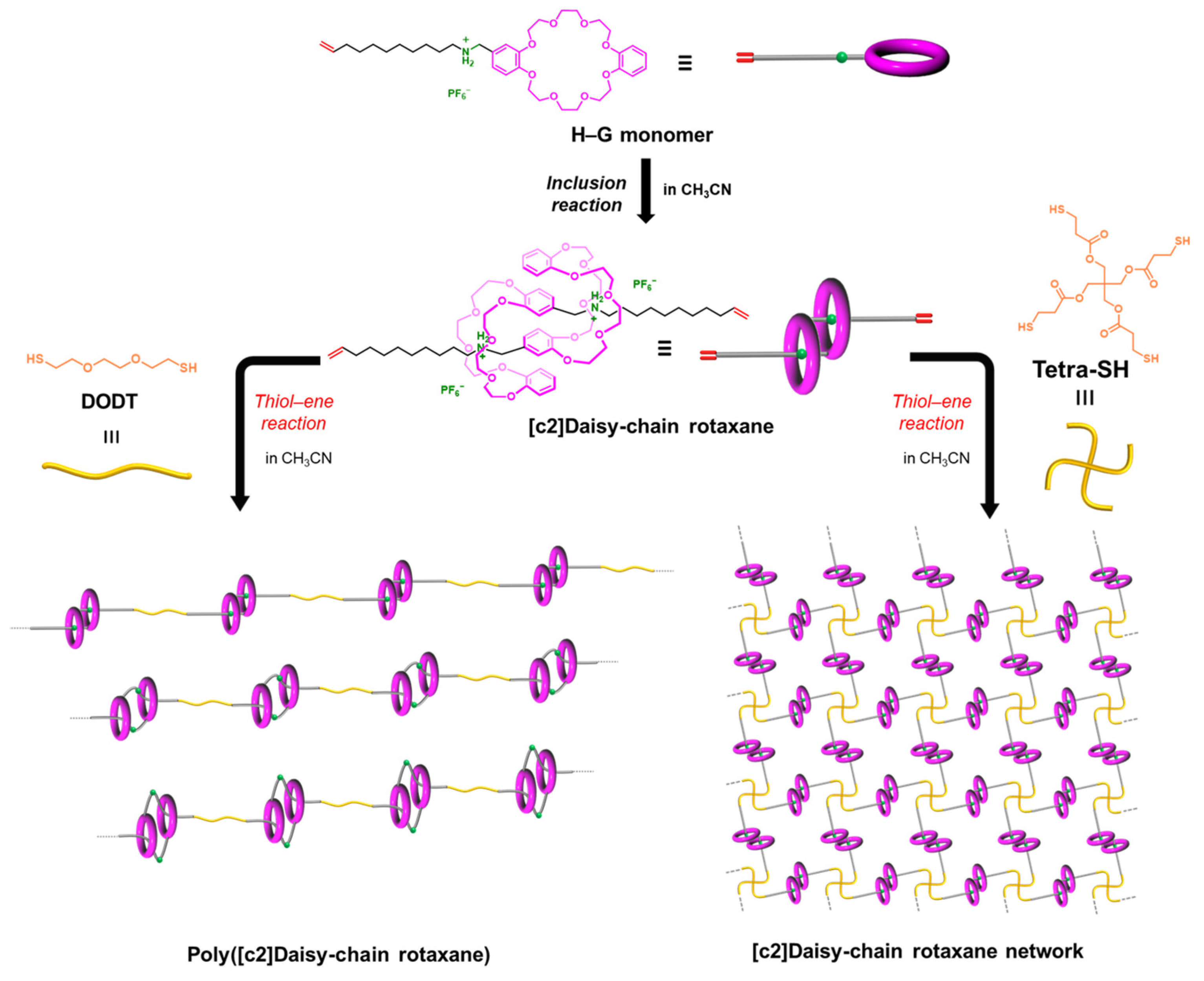 - Zhang, Z.; You, W.; Li, P.; Zhao, J.; Guo, Z.; Xu, T.; Chen, J.; Yu, W.; Yan, X. Insights into the Correlation of Microscopic Motions of [c2]Daisy Chains with Macroscopic Mechanical Performance for Mechanically Interlocked Networks. J. Am. Chem. Soc. 2023, 145, 567–578. [Google Scholar] [CrossRef] [PubMed]