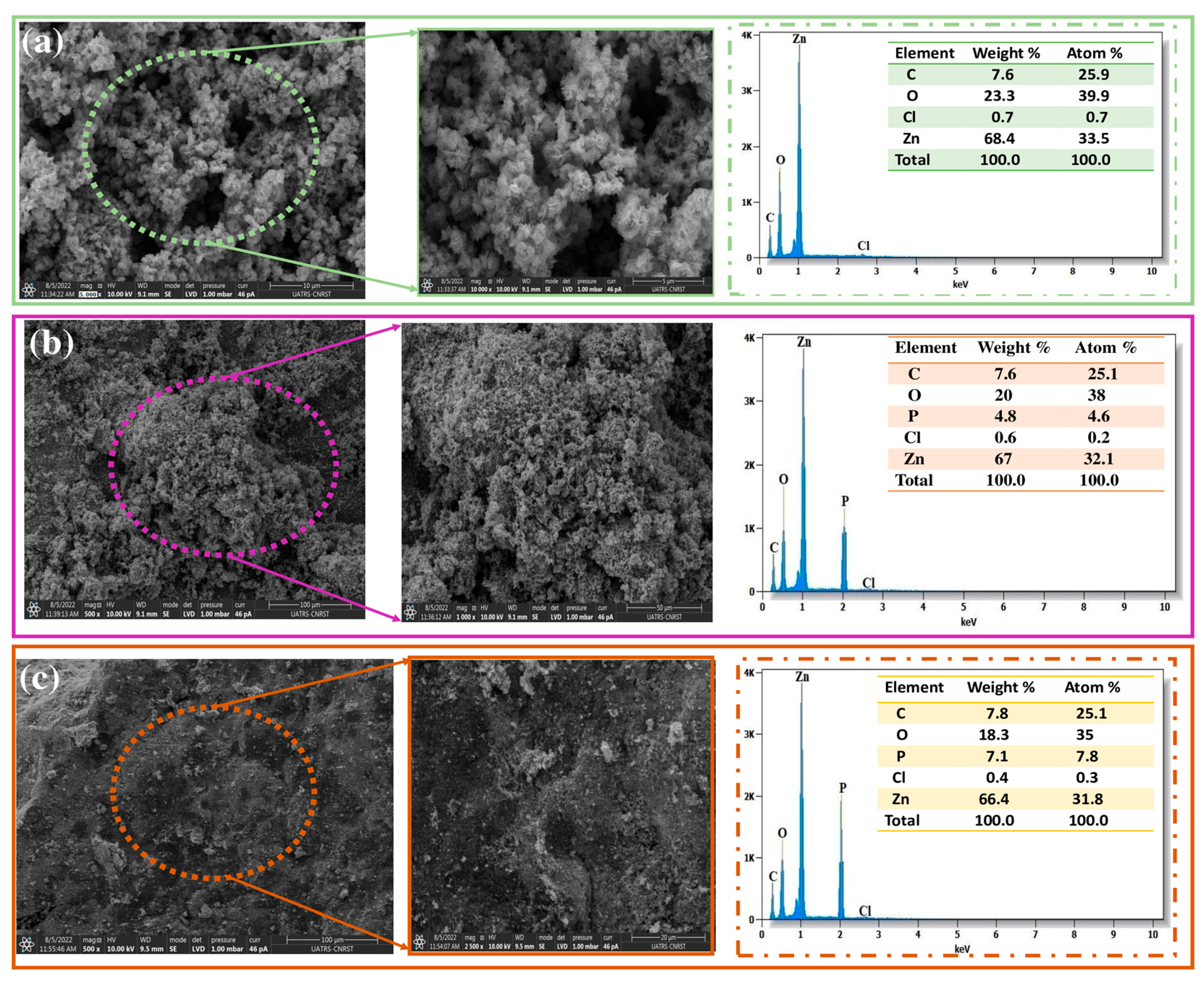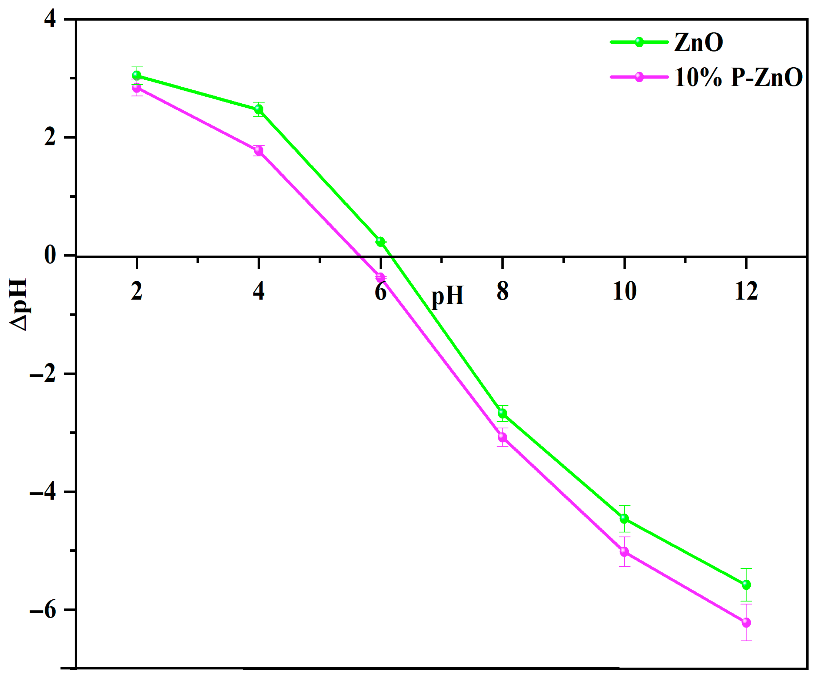 3.6. Effect of Phosphorus Doping on the pHpzc of ZnO Nanoparticles