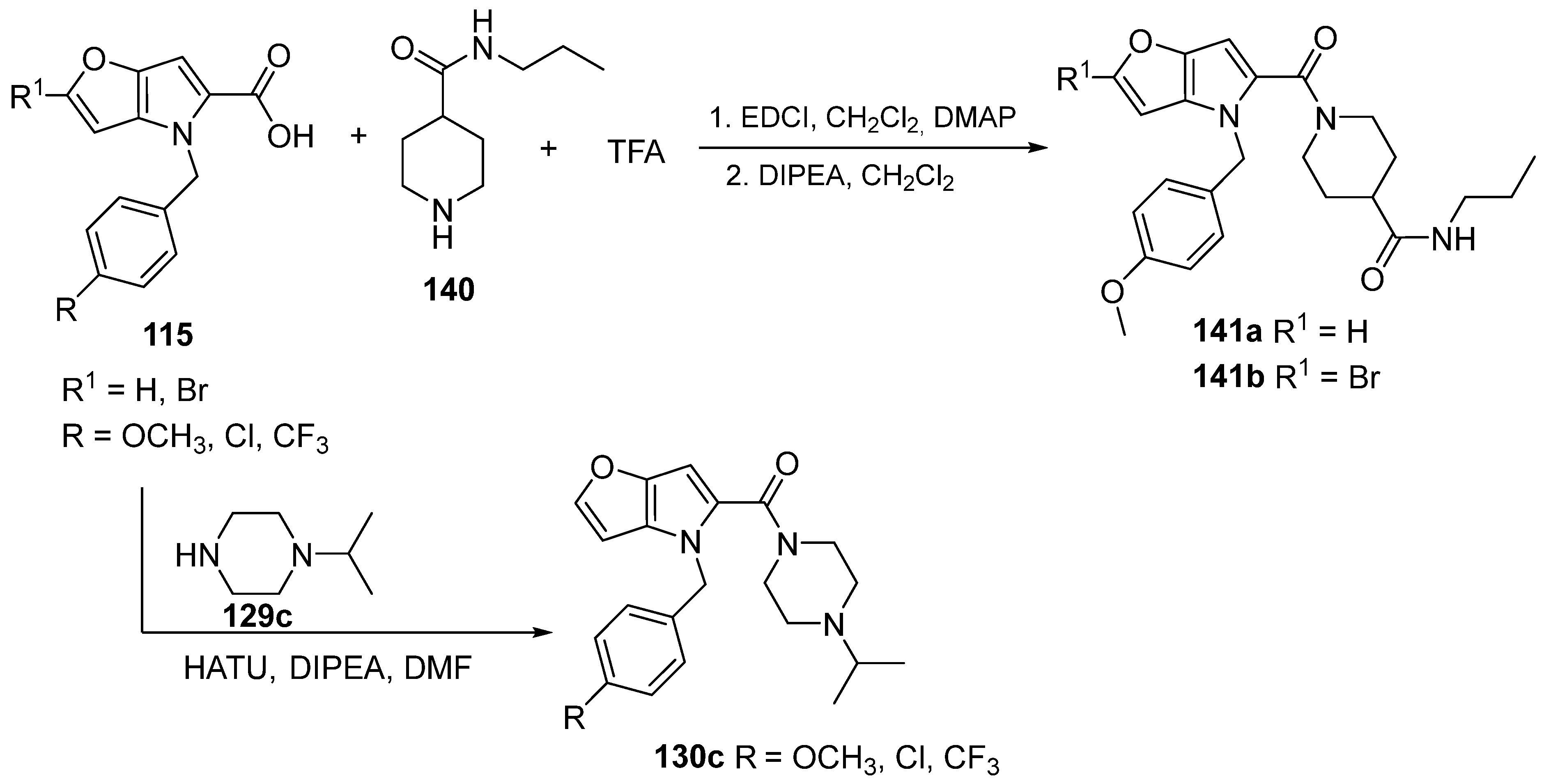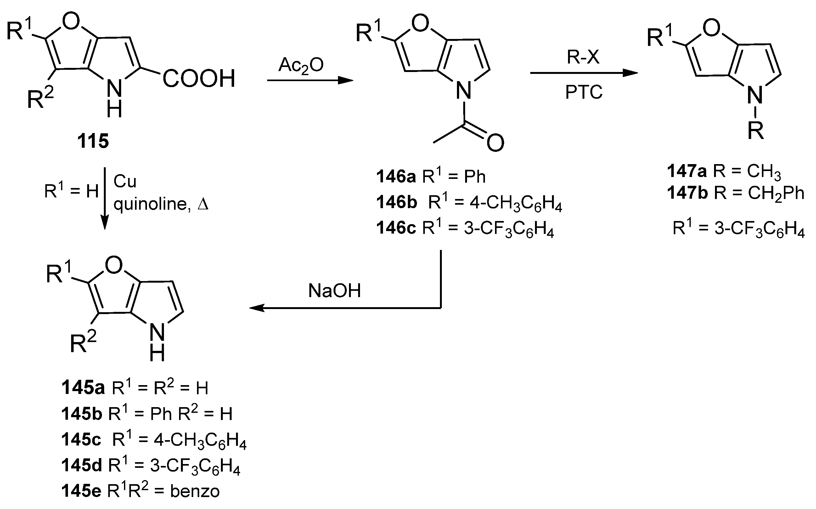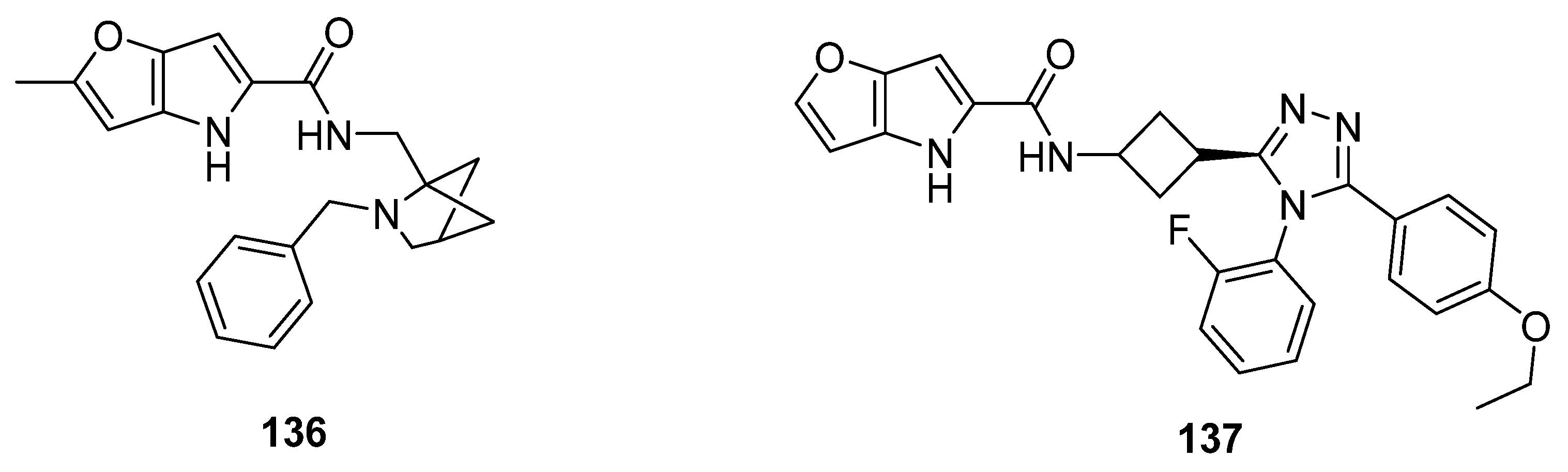 - Krutošíková, A.; Hanes, M. Substituted 4-Benzylfuro [3,2-b]pyrroles. Collect. Czechoslov. Chem. Commun. 1991, 57, 1487–1494. [Google Scholar] [CrossRef]