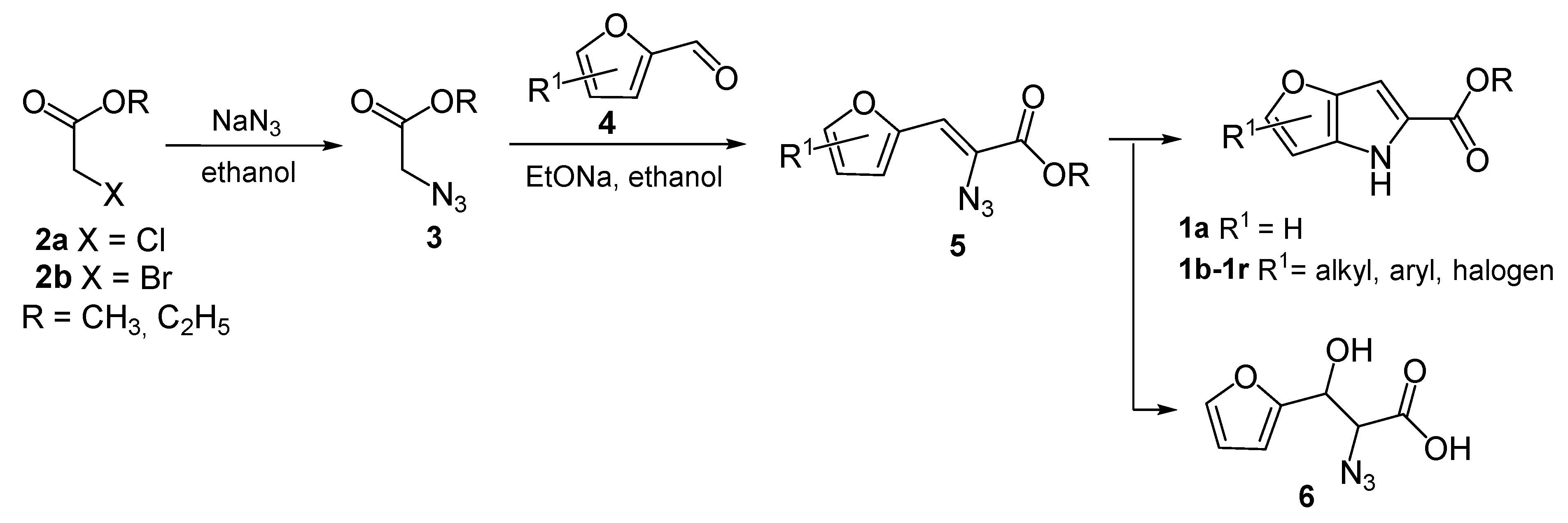 - Hemetsberger, H.; Knittel, D. Synthese und Thermolyse von α-Azidoacrylestern. Monatsh. Chem. 1972, 103, 194–204. [Google Scholar] [CrossRef]