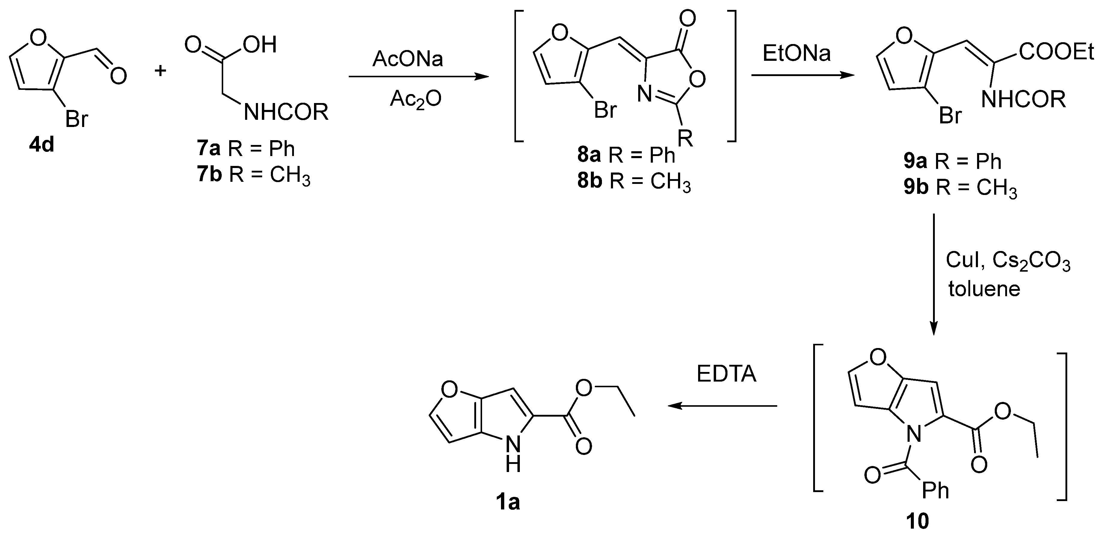 - Puterová, Z.; Sterk, H.; Krutošíková, A. Reaction of Substituted Furan-2-carboxaldehydes and Furo[b]pyrrole Type Aldehydes with Hippuric Acid. Molecules 2004, 9, 11–21. [Google Scholar] [CrossRef] [PubMed]