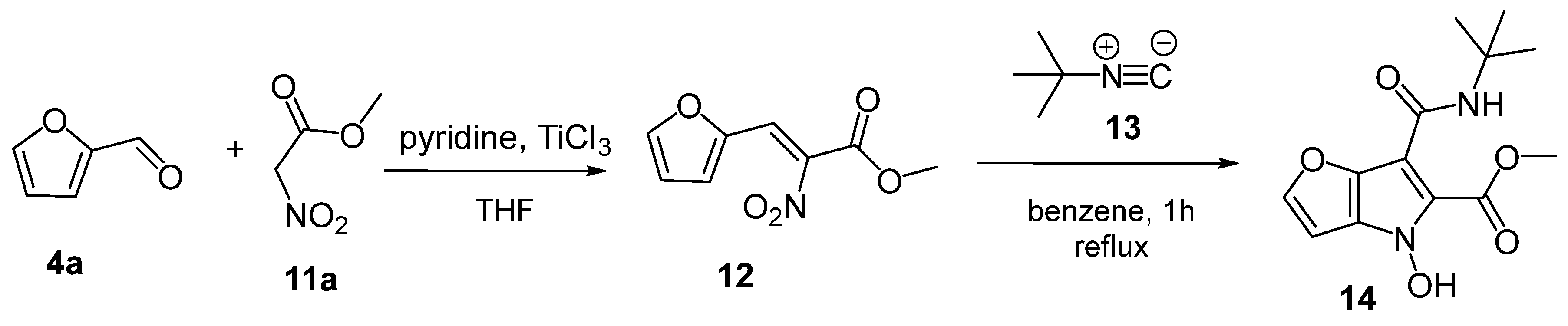 - Foucaud, A.; Razorilalana-Rabearivony, C.; Loukakou, E.; Person, H. [1 + 4] Cycloaddition of Isocyanides with 1-Aryl-2-nitro-1-propenes, Methyl 2-Nitro-3-arylpropenoates, and Methyl 2-Nitro-2,4-pentadienoates. Synthesis of 1-Hydroxyindoles and 1-Hydroxypyrroles. J. Org. Chem. 1983, 48, 3639–3644. [Google Scholar] [CrossRef]
