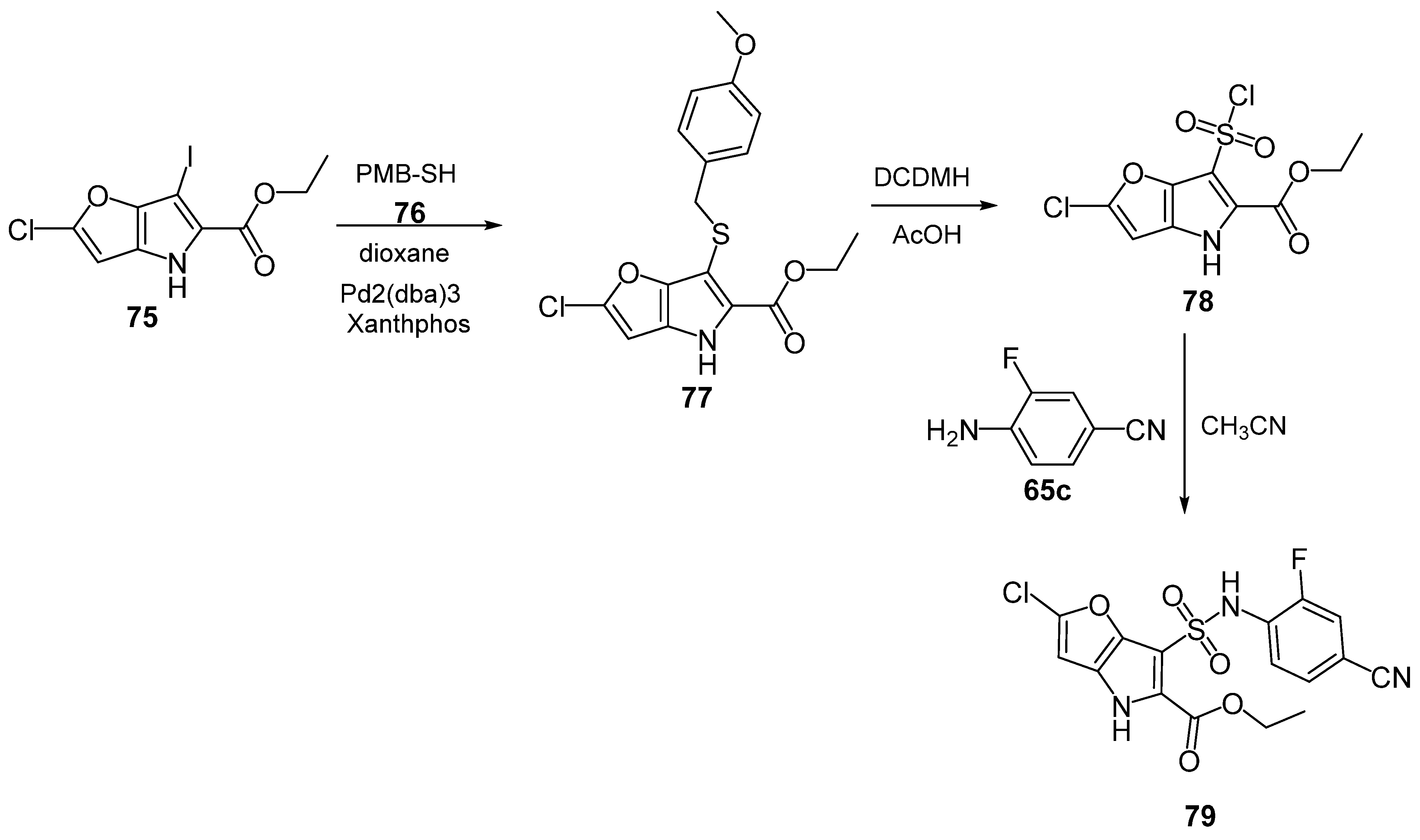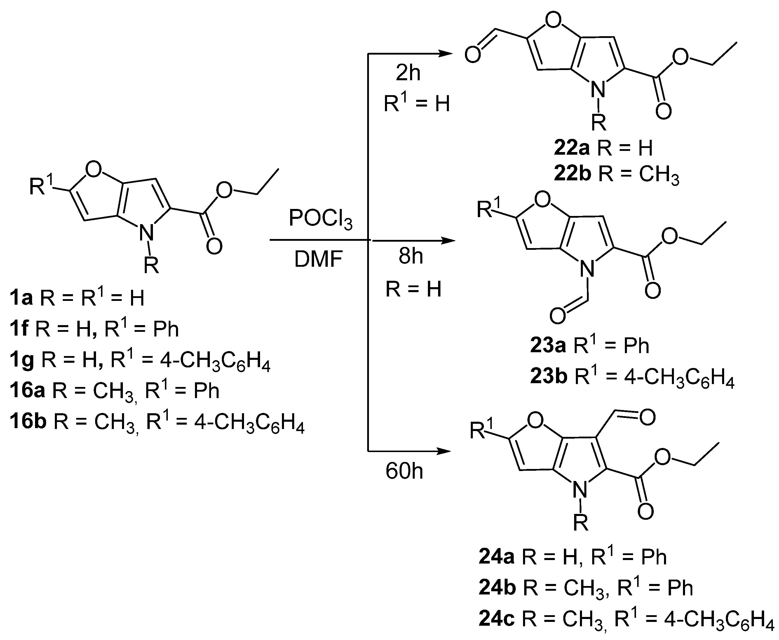 - Kráľovičová, E.; Krutošíková, A.; Kováč, J.; Dandárová, M. Electrophilic substitution reactions of furo [3,2-b]pyrrole derivatives. Collect. Czechoslov. Chem. Commun. 1986, 51, 106–111. [Google Scholar] [CrossRef]