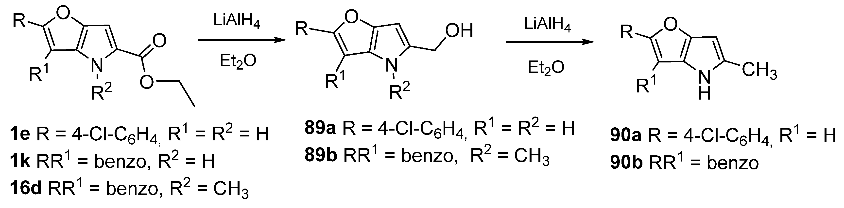 - Krutošíková, A.; Kováč, J.; Chudobová, M.; Ilavský, D. Reactions of ethyl 2-(4-chlorophenyl)-4H-furo [3,2-b]pyrrole-5-carboxylate. Collect. Czechoslov. Chem. Commun. 1980, 45, 2949–2957. [Google Scholar] [CrossRef]