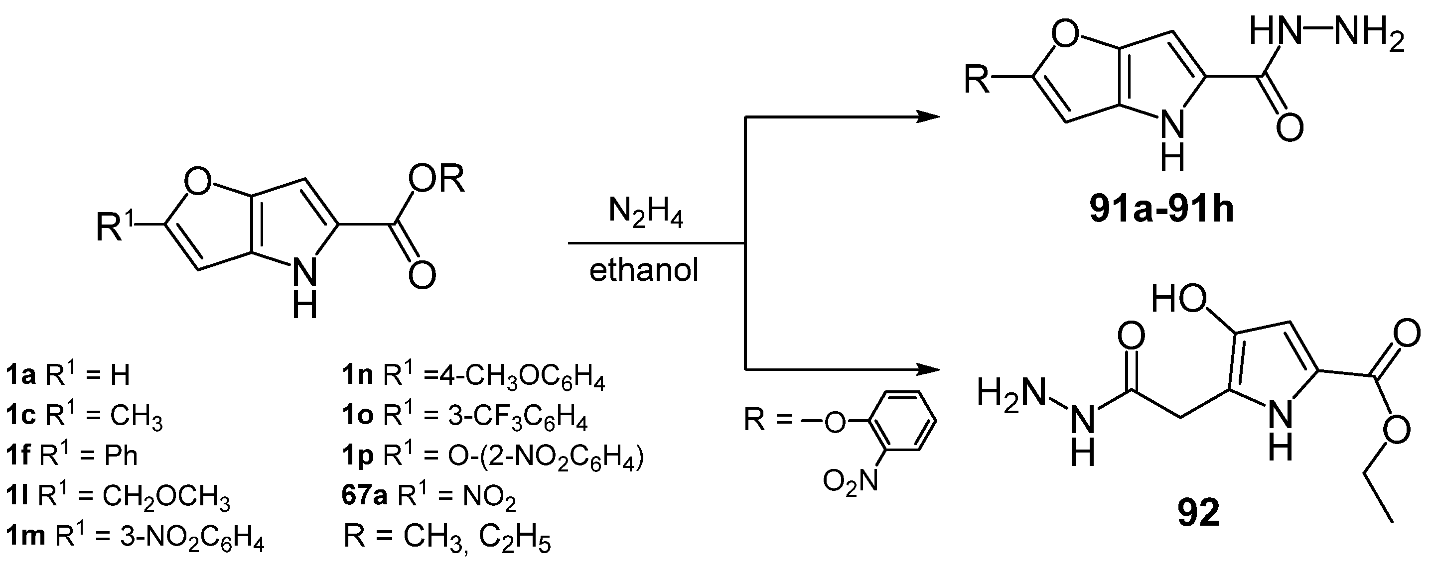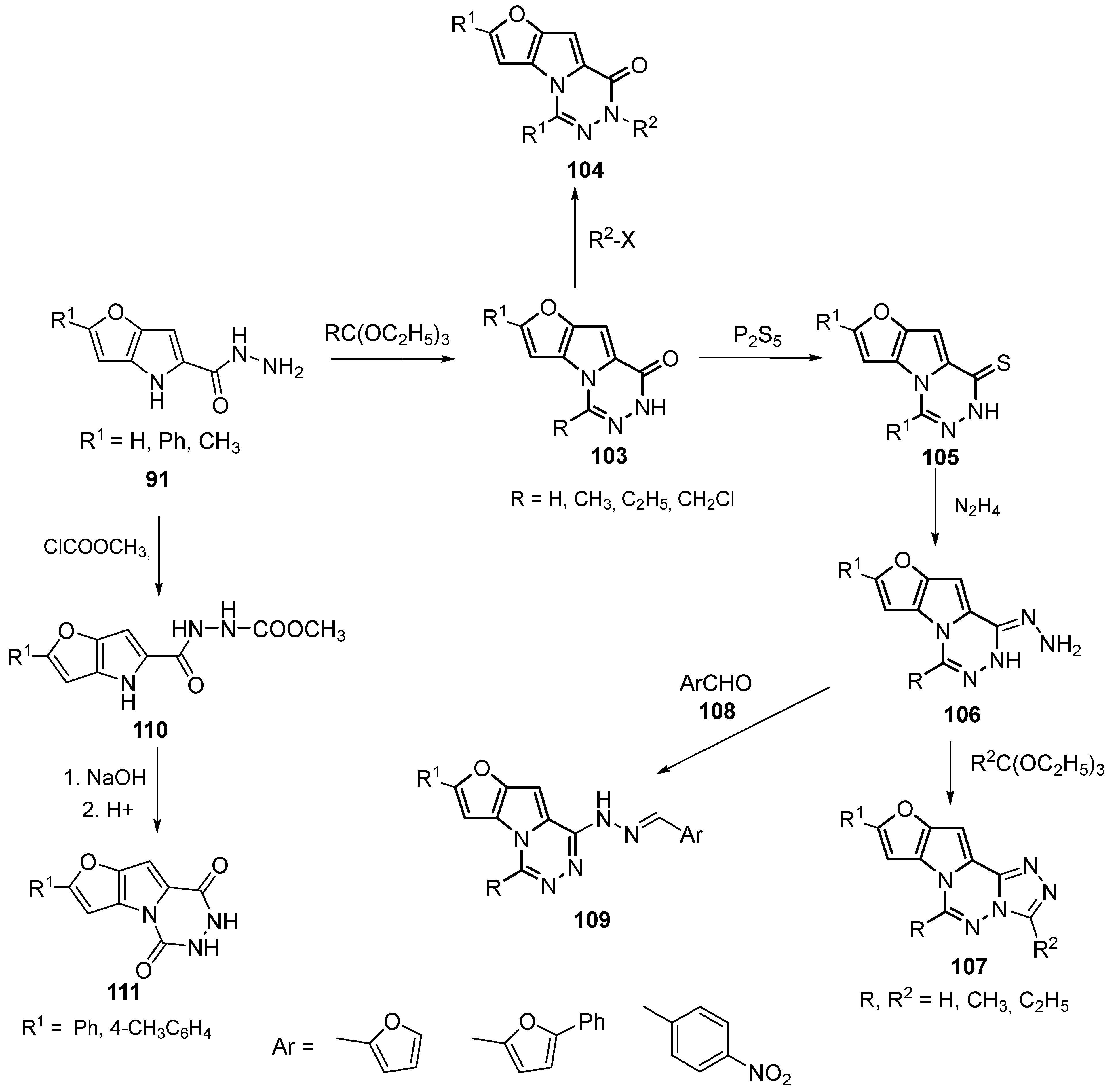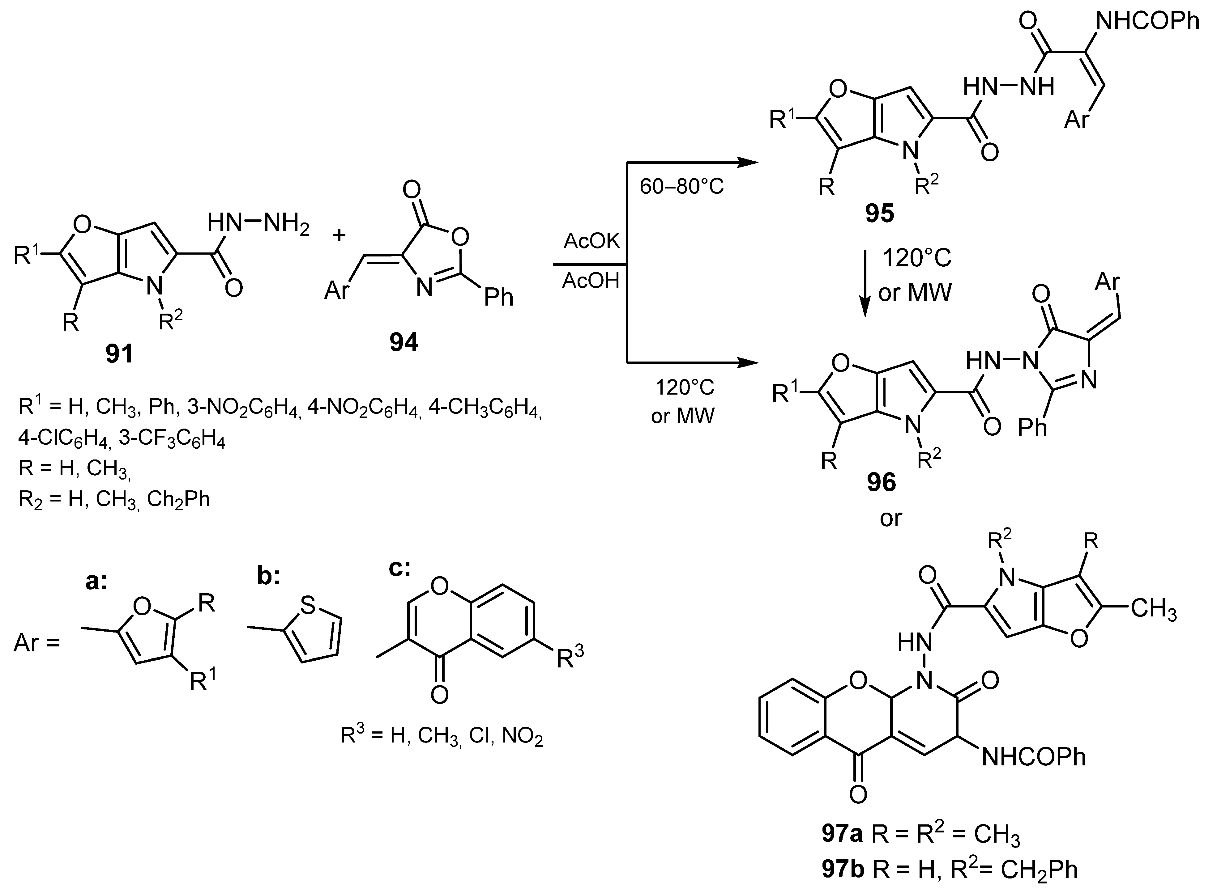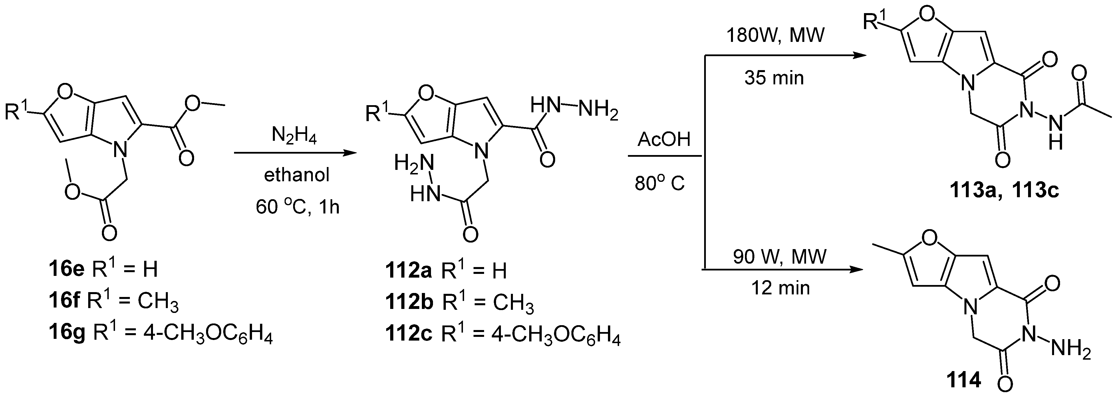- Gašparová, R.; Lácová, M.; Krutošíková, A. Reactions of substituted furo [3,2-b]pyrrole-5-carbohydrazides under classical and microwave conditions. Collect. Czechoslov. Chem. Commun. 2005, 70, 2101–2111. [Google Scholar] [CrossRef]