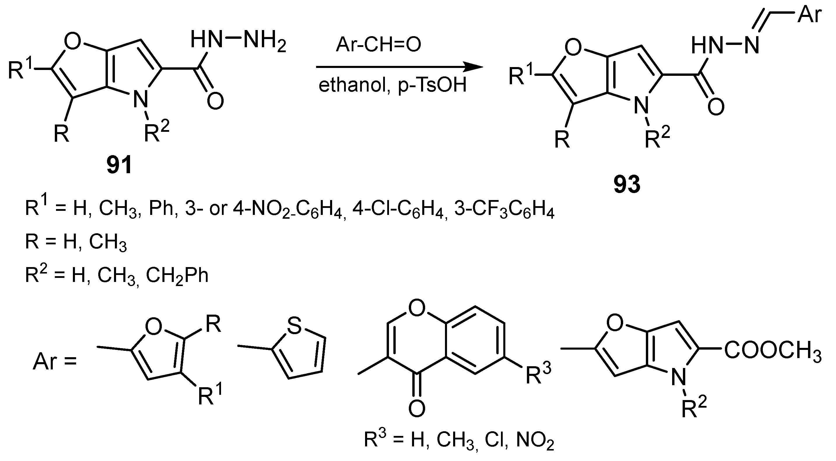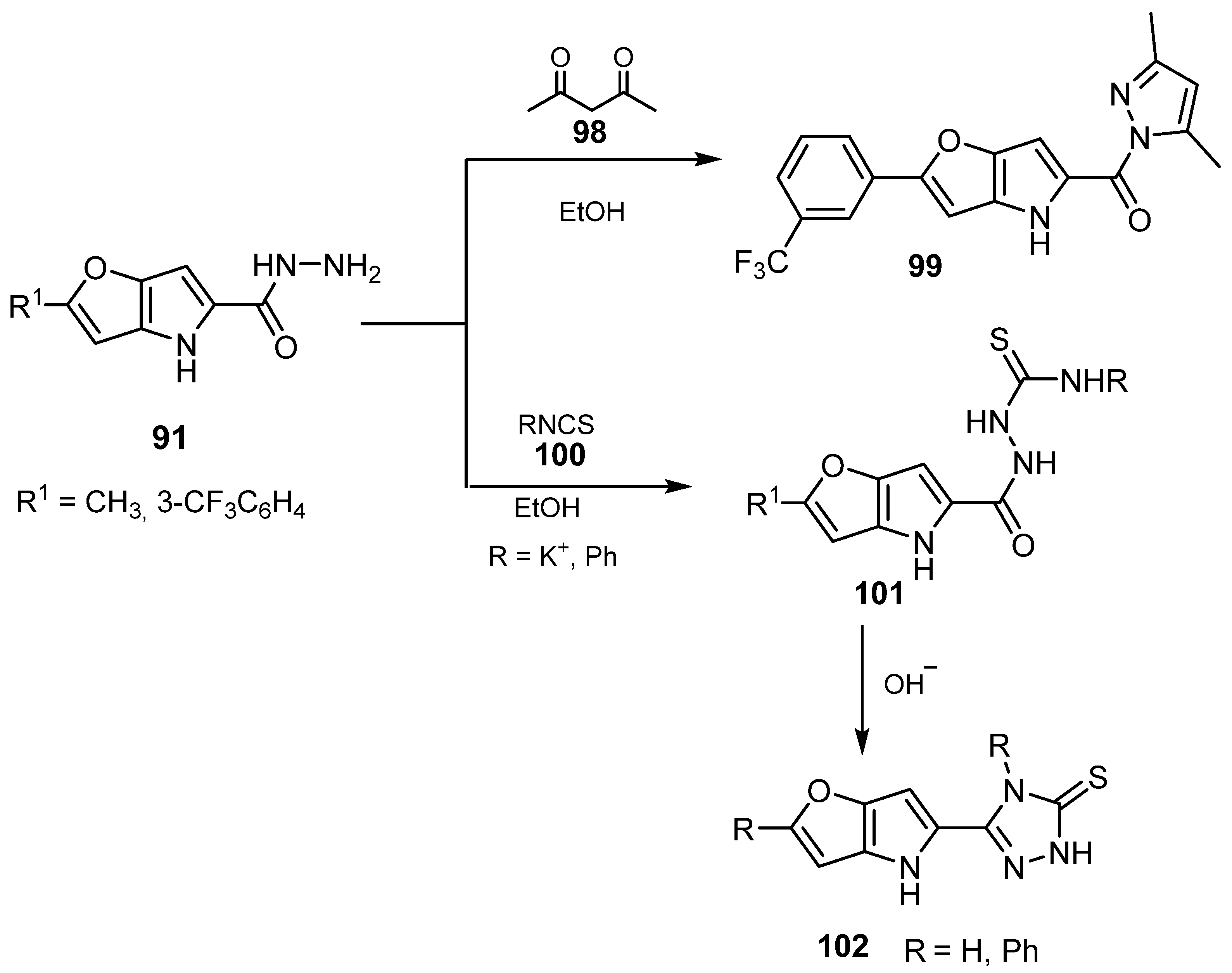 - Gašparová, R.; Moncman, M.; Horváth, B. Microwave assisted reactions of 2-[3-(Trifluoromethyl)phenyl]-4-R1-furo [3,2-b]pyrrole-5-carboxhydrazides. Cent. Eur. J. Chem. 2008, 6, 180–187. [Google Scholar] [CrossRef]