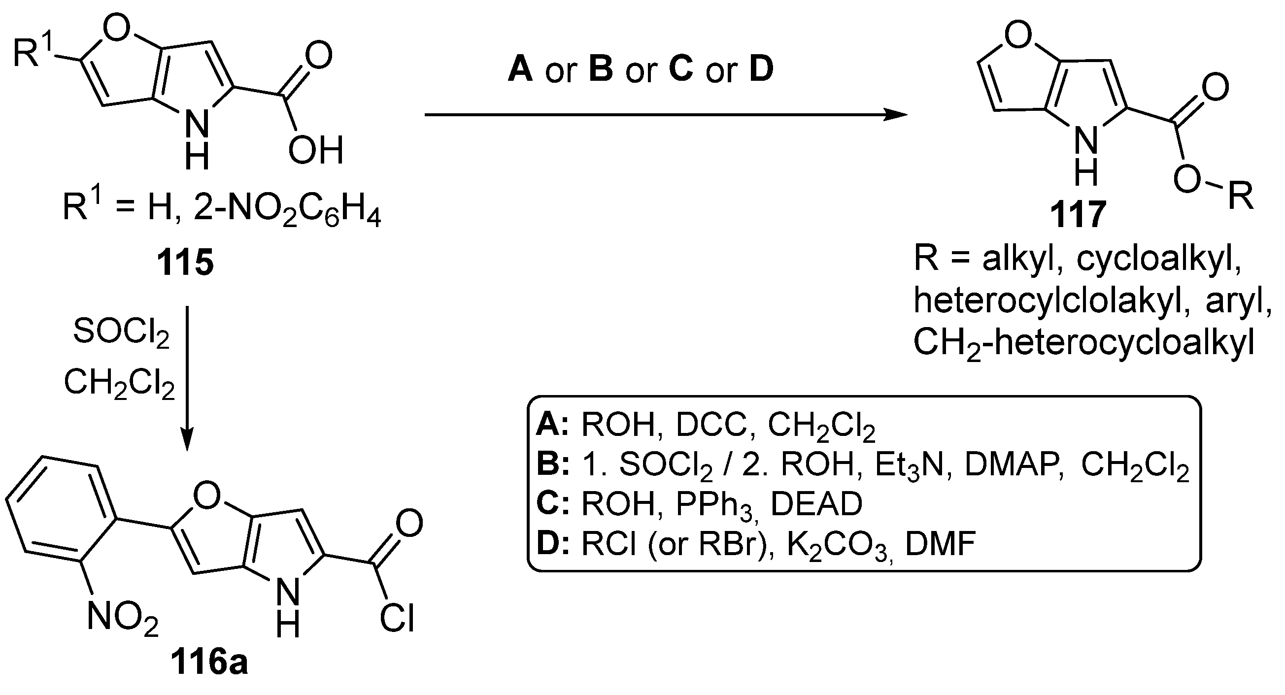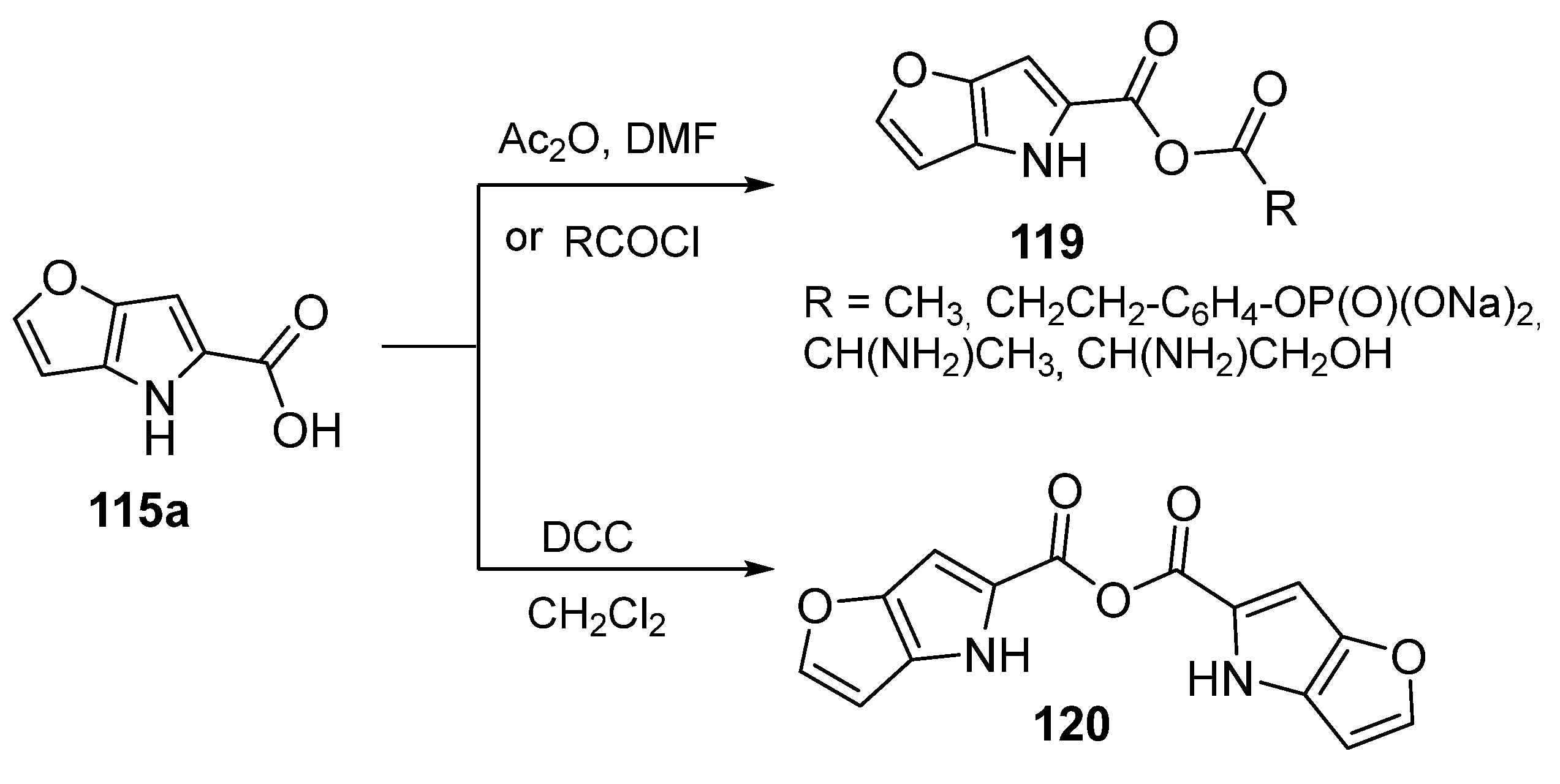 - Krutošíková, A.; Dandárová, M. Reactions of Methyl 2-Formylfuro [3,2-b]pyrrole-5-carboxylates. Chem Pap. 1996, 50, 72–76. [Google Scholar]