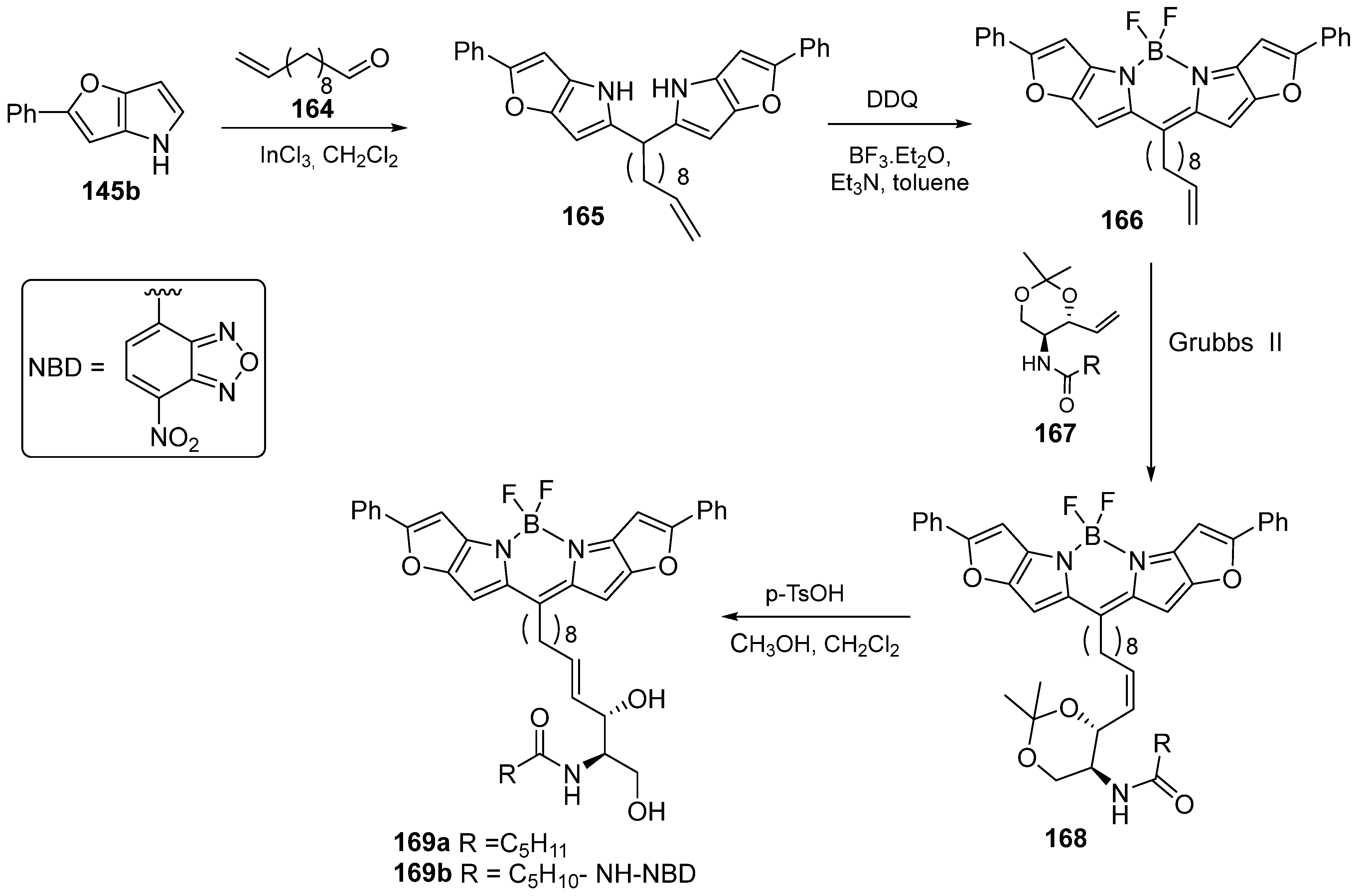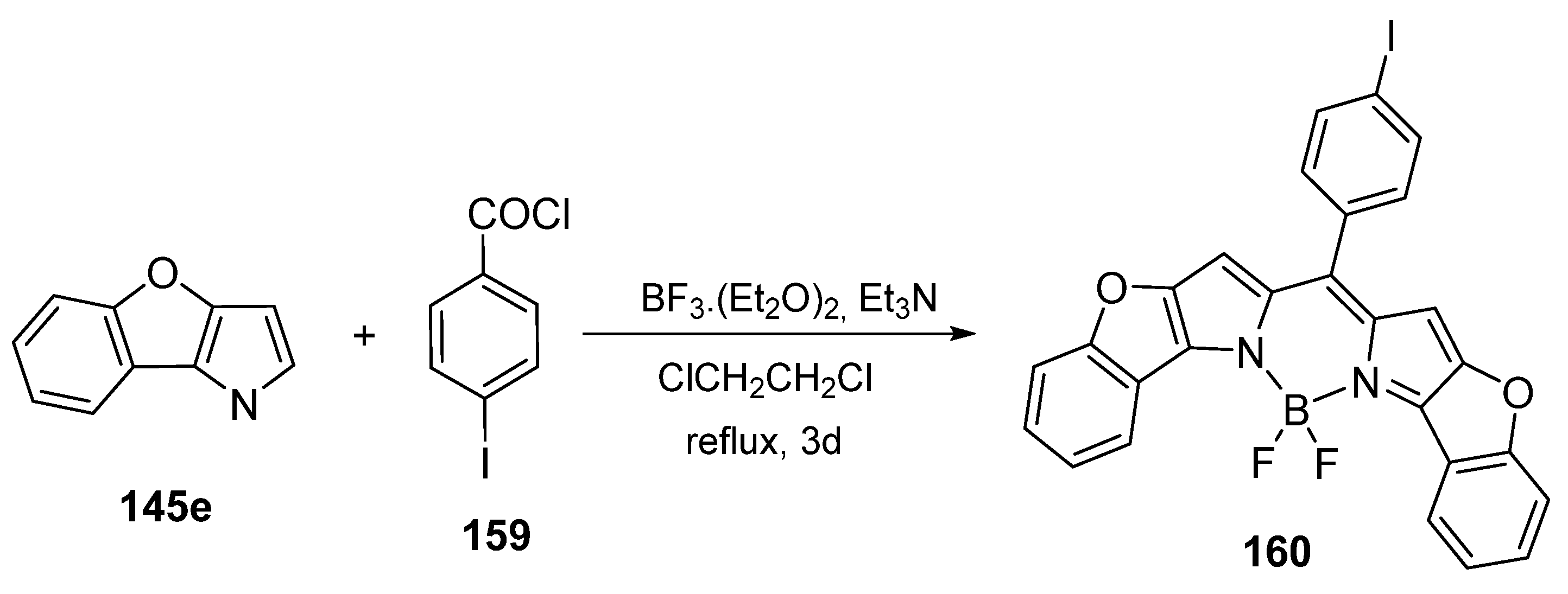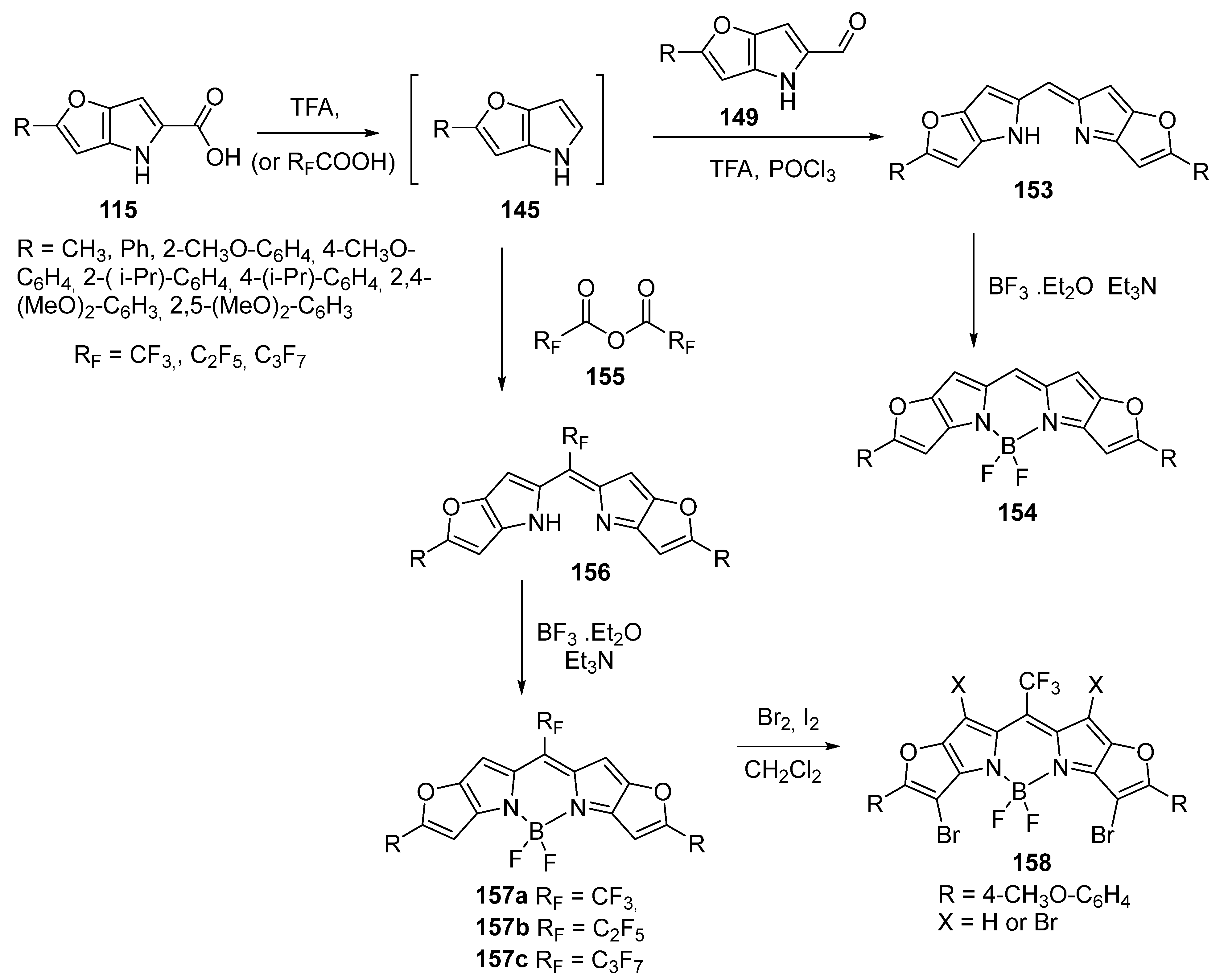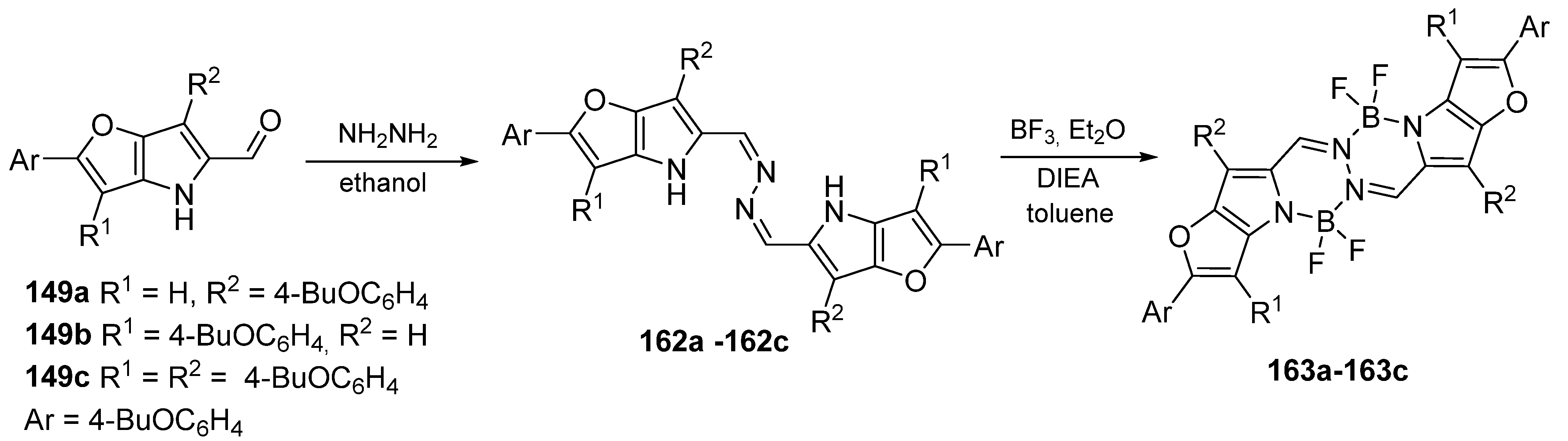 - Zhou, L.; Xu, D.; Gao, H.; Zhang, C.; Ni, F.; Zhao, W.; Cheng, D.; Liu, X.; Han, A. β-Furan-Fused bis(Difluoroboron)-1,2-bis((1H-pyrrol-2-yl)methylene)hydrazine Fluorescent Dyes in the Visible Deep-Red Region. J. Org. Chem. 2016, 81, 7439–7447. [Google Scholar] [CrossRef]
