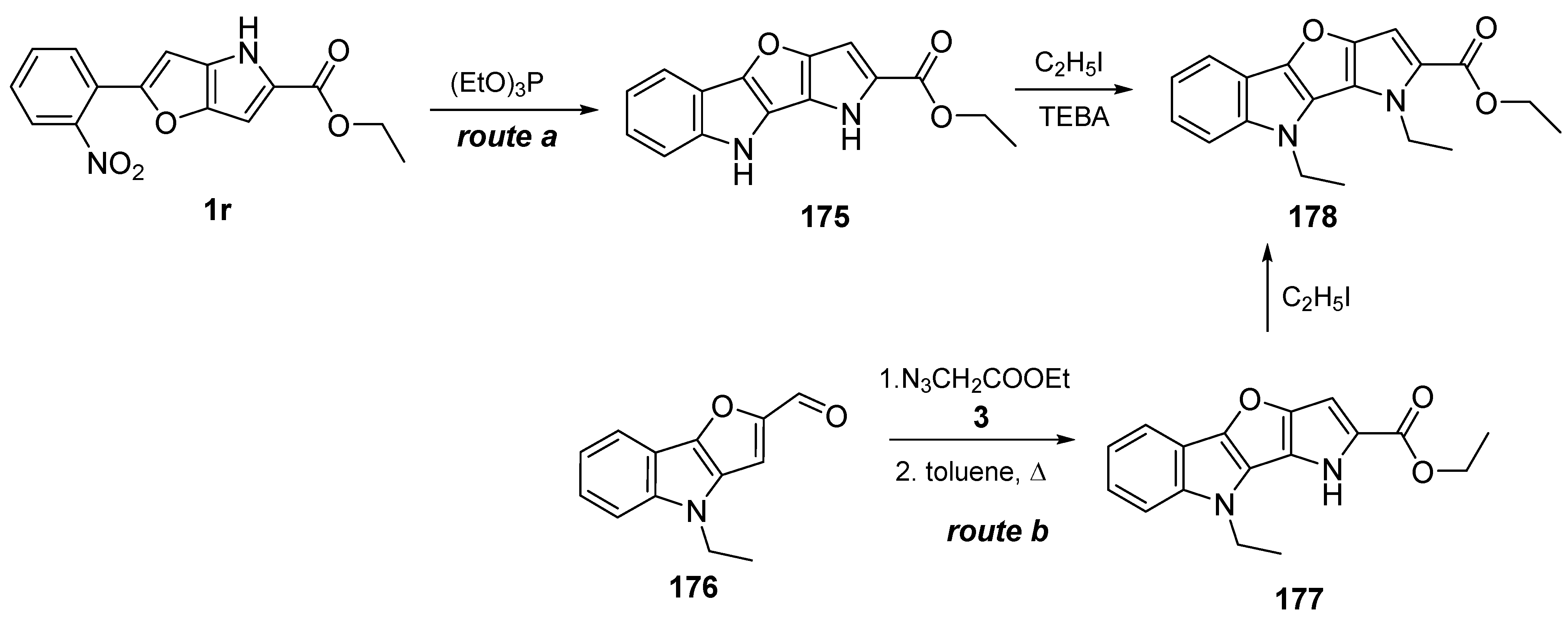 - Tokárová, Z.; Gašparová, R.; Kabaňová, M.; Gašparová, M.; Balogh, R. Hemetsberger–Knittel and Ketcham Synthesis of Heteropentalenes with Two (1:1), Three (1:2)/(2:1) and Four (2:2) Heteroatoms. Reactions 2023, 4, 254–273. [Google Scholar] [CrossRef]