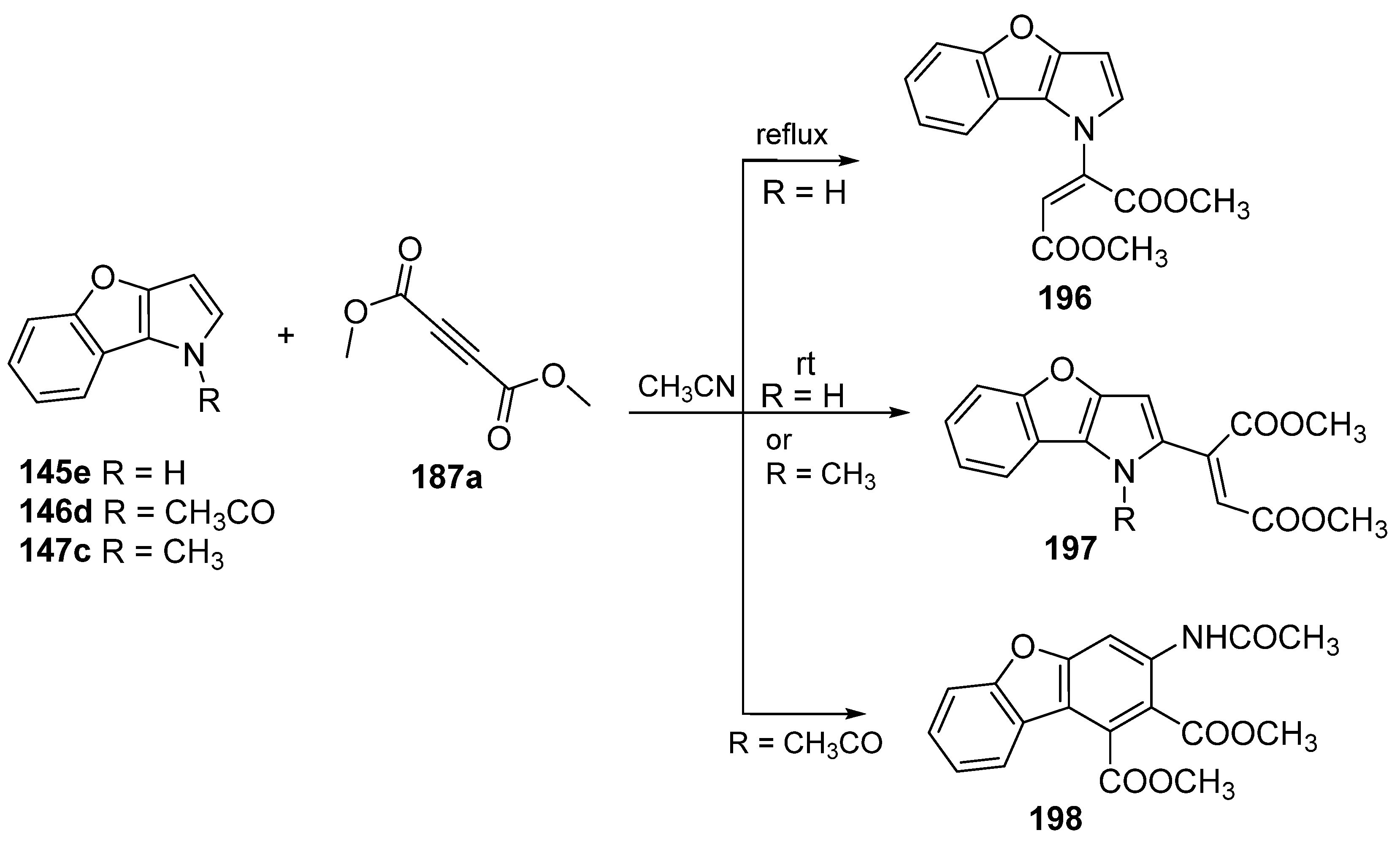 - Krutošíková, A.; Kráľovičová, E.; Dandárová, M.; Kelemen, P. Reactions of furo [3,2-b]pyrroles and their benzo[b] analogues. Chem. Pap. 1988, 42, 89–95. [Google Scholar]