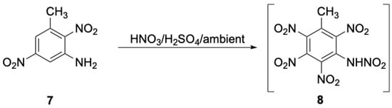 However, with less basic amines, the fuming nitric acid approach is more successful [19]. Most anilines are accessible for direct nitration [20,21,22,23,24,25,26,27,28,29], e.g., as seen in the work of Atkins on polynitro anilines, see synthesis of compound 8 in Scheme 1 [28,30]. Nonetheless, one should be careful with acidic conditions when aromatic nitramines are obtained, as the nitro group easily migrates to the aromatic ring system when possible [31,32,33].