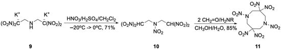 The synthesis of 1,3,3,5,7,7-hexanitro-1,5-diazocane (11) via nitramine 10 by Cichra et al. [41].