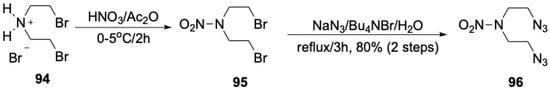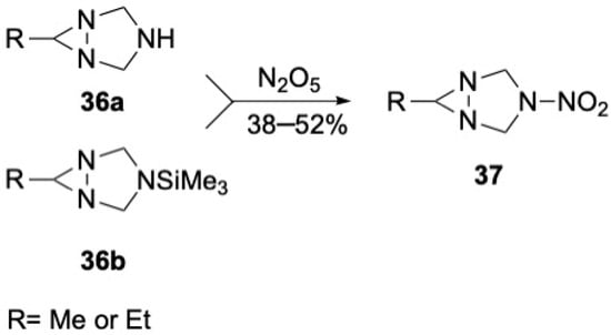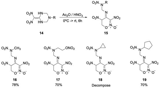 Recent examples of this type of protocol are found in the synthesis of several FOX-7 derived nitramines 16–19 via a rearrangement of triazine 14 [48,49], see Scheme 4.