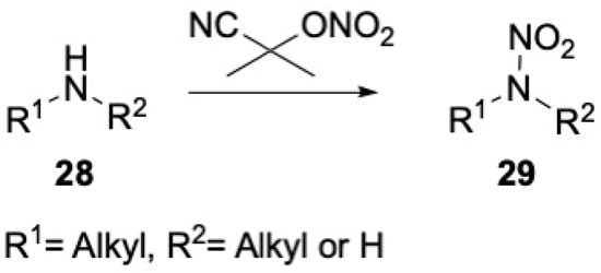 One example is the cyanohydrin nitrates—particularly acetone cyanohydrin nitrate [69], e.g., see nitration of amine 28 to give nitramine 29 in Scheme 8, while the scope and reported yields can be found in Table 2. This can be used as an effective type of nitration reaction, under mild, non-acidic conditions.
