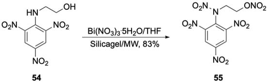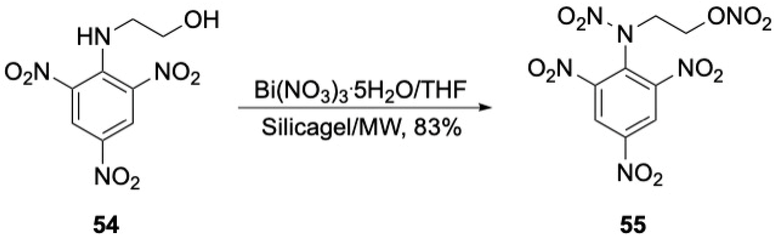 Thionyl nitrate and N-nitropyridininum can be applied as nitration agents, as shown in the syntheses of Bu-NENA [73,74]. Both reagents were used in two equivalents to the amine, and good yield (70% for thionyl nitrate, 75% for N-nitropyridinium nitrate) was obtained within hours on ice-bath.