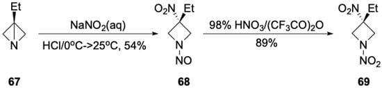 Archibald et al. synthesized N-nitroazetidines 23a–c from azetidine hydrochlorides 22a–c, as depicted in Scheme 6 [59]. This synthesis was of interest to investigate the effect of ring strain in nitramine synthesis. The nitration was successful, with a yield of 87%. Rykaczewski et al. developed a general procedure for N-nitroazetidines, applying similar nitration systems, using nitric acid and acetic anhydride with similar yield [60].