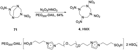 - Zhi, H.Z.; Luo, J.; Feng, G.A.; Lv, C.X. An efficient method to synthesize HMX by nitrolysis of DPT with N2O5 and a novel ionic liquid. Chin. Chem. Lett. 2009, 20, 379–382. [Google Scholar] [CrossRef]