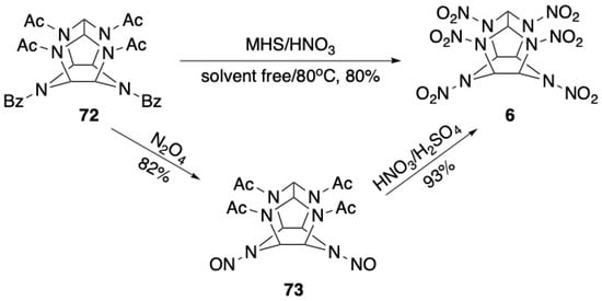 - Bayat, Y.; Zolfigol, M.A.; Khazaei, A.; Mokhlesi, M.; Daraei, M.; Heydari Nezhad Tehrani, A.; Chehardoli, G. Synthesis of 2,4,6,8,10,12-Hexanitro-2,4,6,8,10,12-hexaazaisowurtzitane Using Melaminium-tris(hydrogensulfate) by a Simple One-Pot Nitration Procedure. Propellants Explos. Pyrotech. 2013, 38, 745–747. [Google Scholar] [CrossRef]