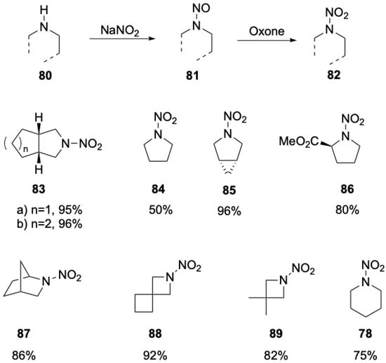 The route is also applicable to secondary amines with reduced basicity due to electron-withdrawing groups in proximity [34,35,36,37,38,39,40,41,42], e.g., see the synthesis of nitramine 10 depicted in Scheme 2.